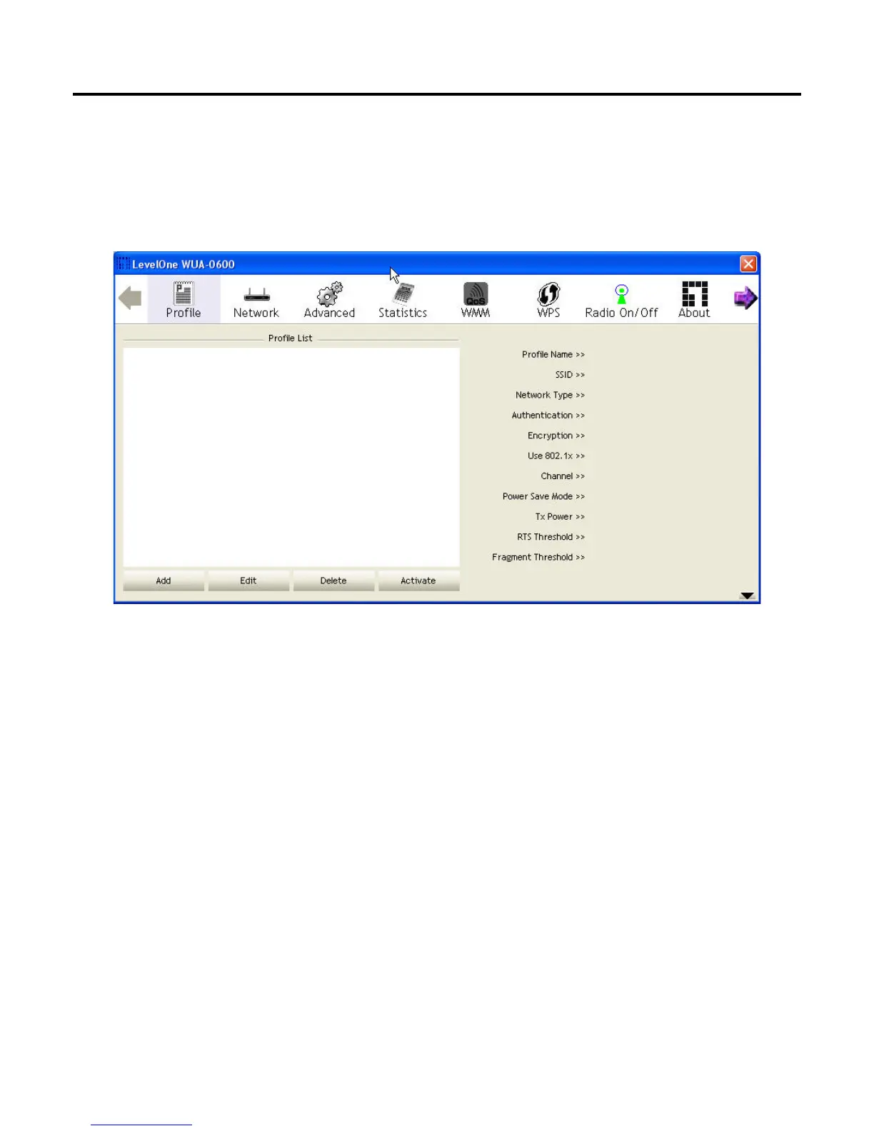 The profile settings page allows you to set and save different wireless settings. You can activate the