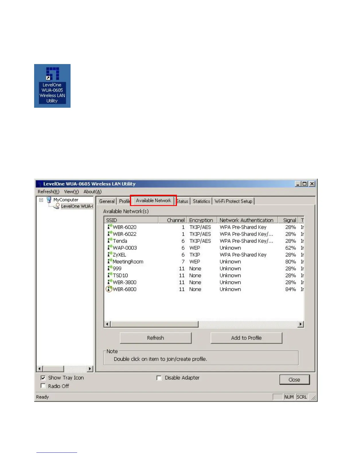 Double click the LevelOne WUA-0605 Wireless LAN Utility on your Windows desktop.