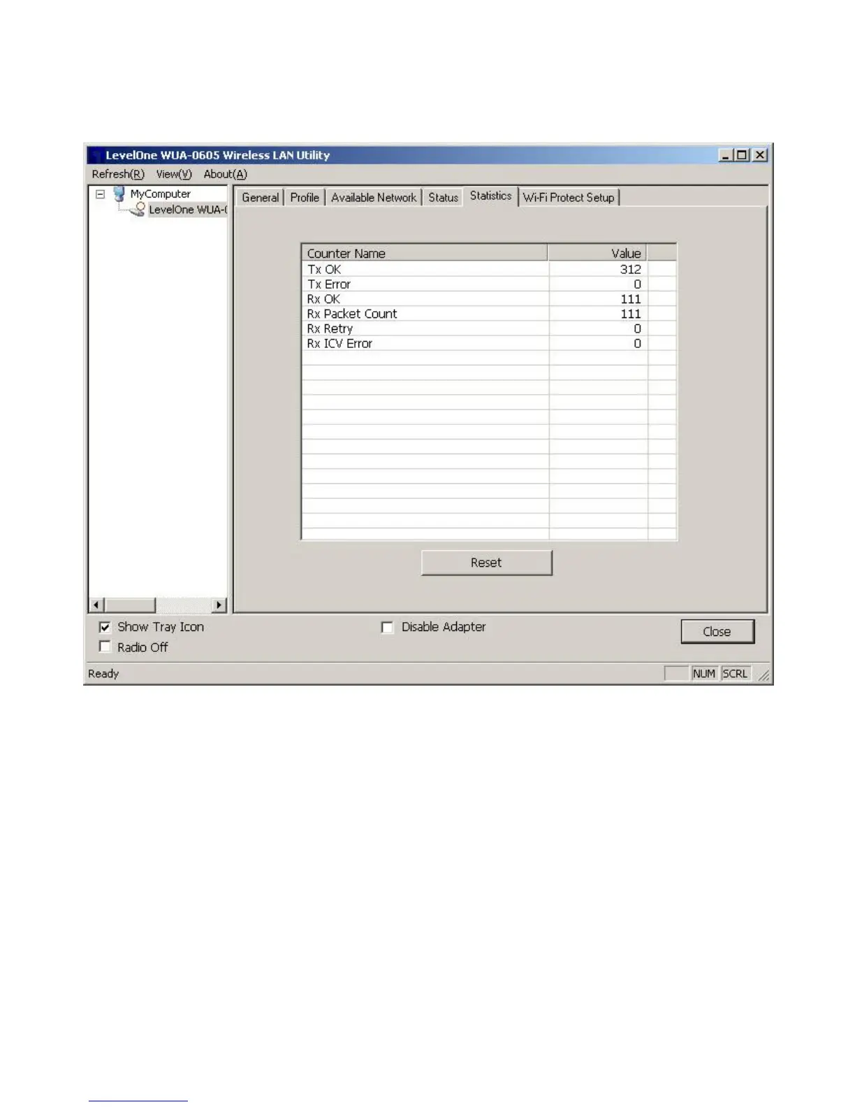 The Statistics tab shows the transmission activity record. Clicking the " Reset " button recounts