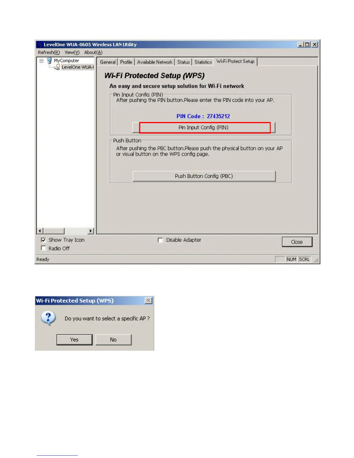 LevelOne WUA-0605 - Step 3: Initiate PIN Input in Utility; Step 4: Select Specific Access Point