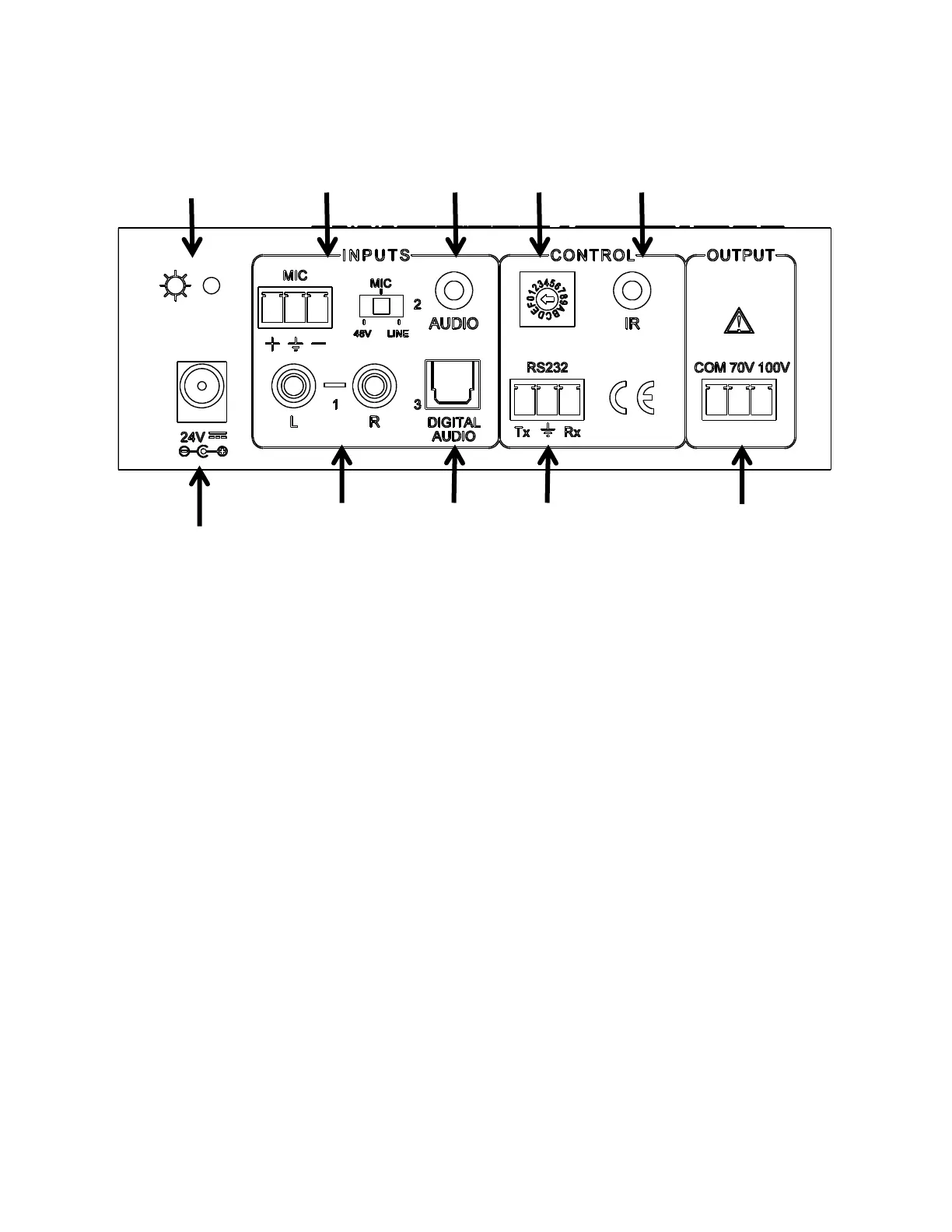 10. OUTPUT : points de connexion de haut-parleurs de 70 ou de 100 V.