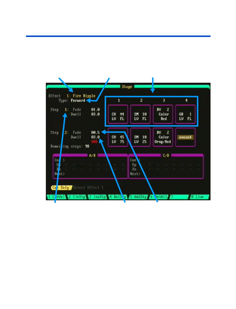 elements and fade/dwell times for each effect step.
