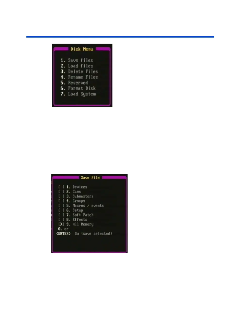 The Disk sub-menu allows you save, load, delete and rename files using a