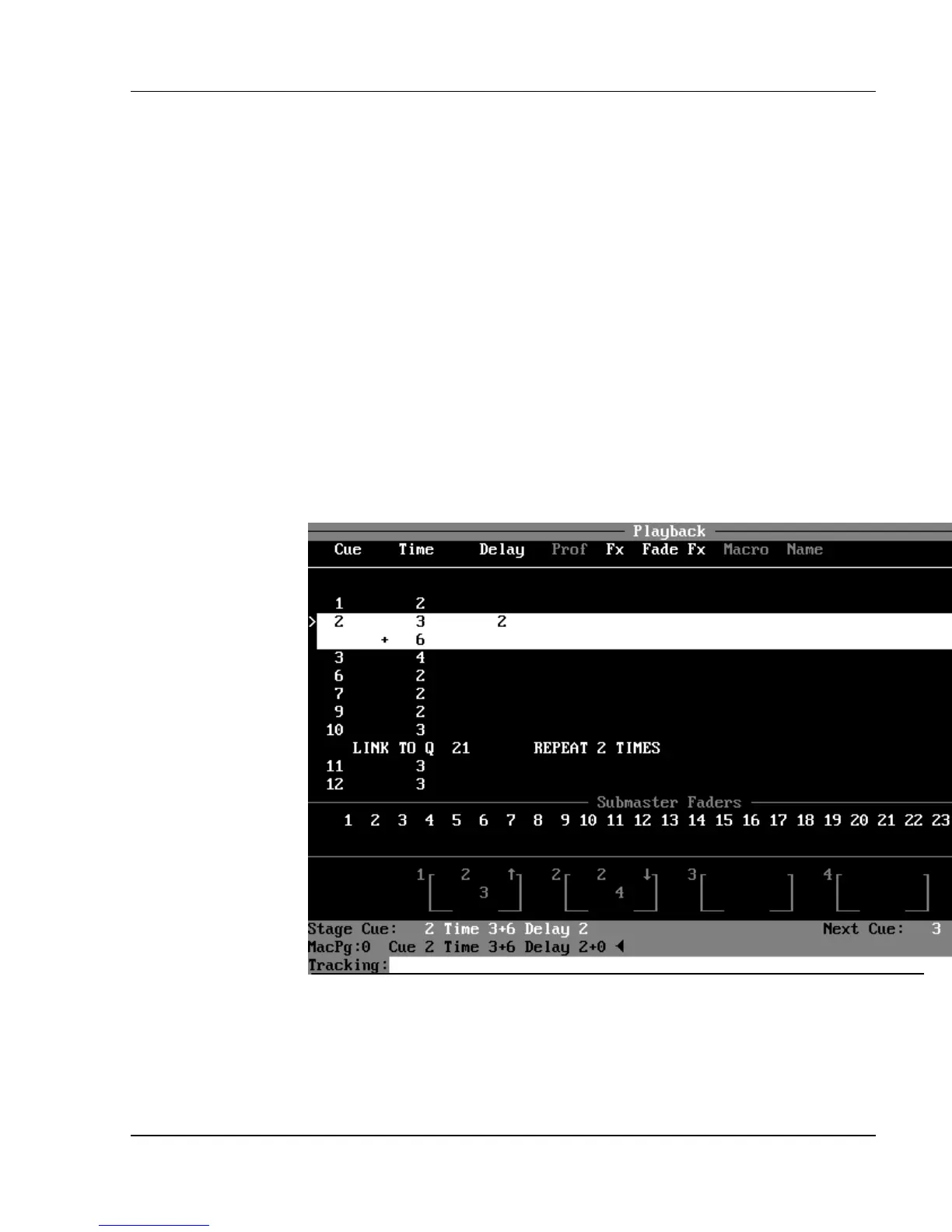down, the next cue loads to a different fader and begins to run. When a Delay