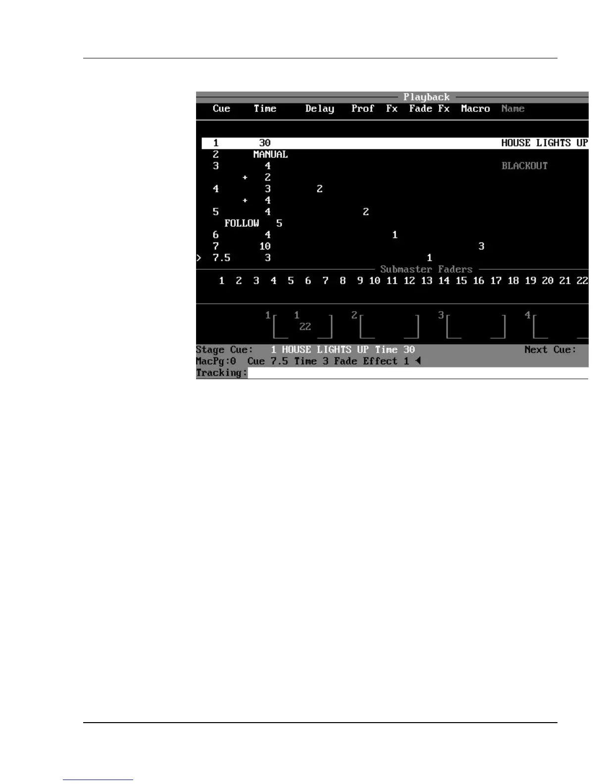?? The current stage cue (shown in reverse video in a horizontal gray band)