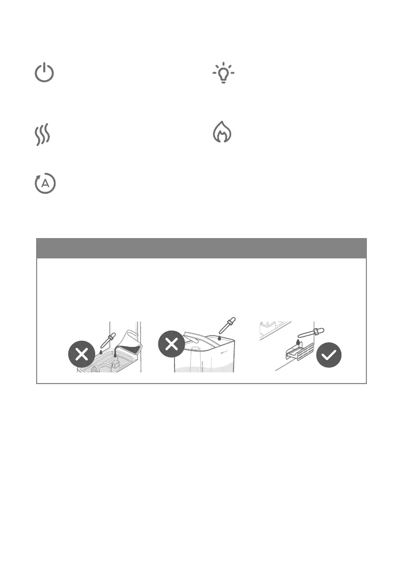 • Do not add essential oils, water treatment liquids, or water filters into the