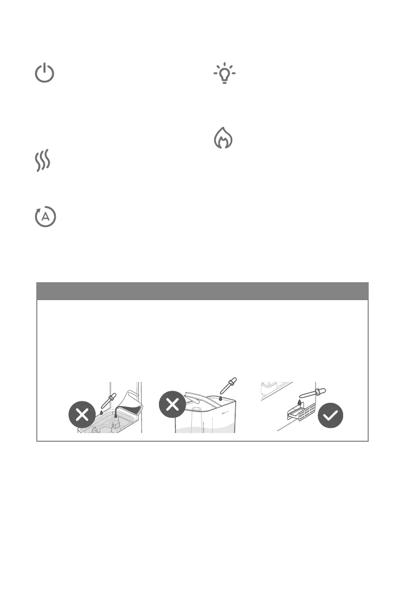 • Geben Sie keine ätherischen Öle, Flüssigkeiten zur Wasseraufbereitung oder Wasserfilter in den