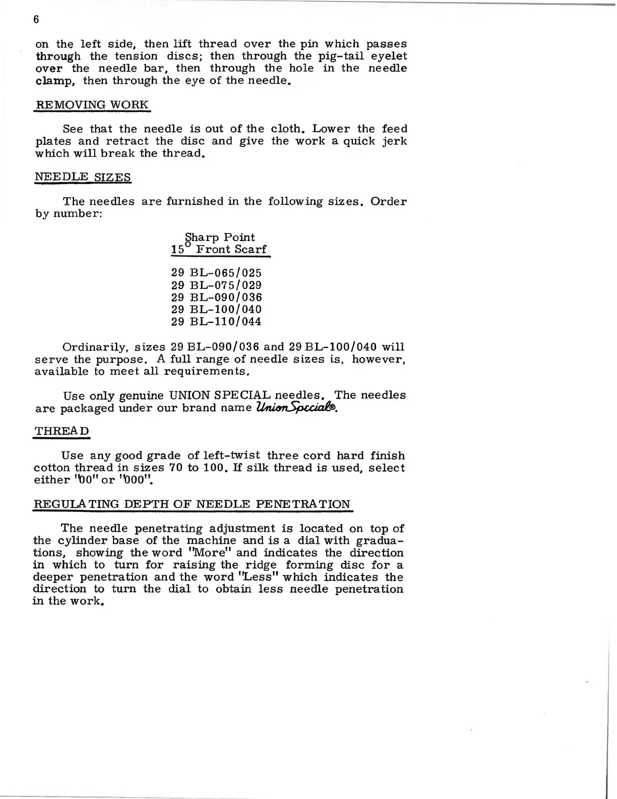 Lewis 150-3 - Machine Operation Details; Work Removal, Needles, Thread, and Penetration Depth