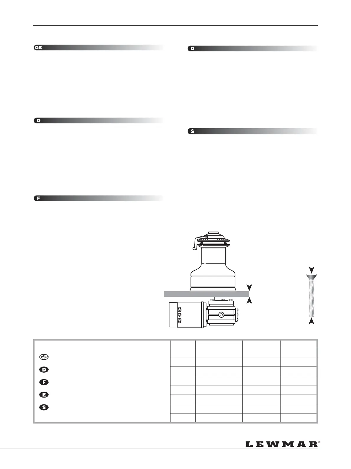 Fix the winch to the deck using the table below for fastening bolt