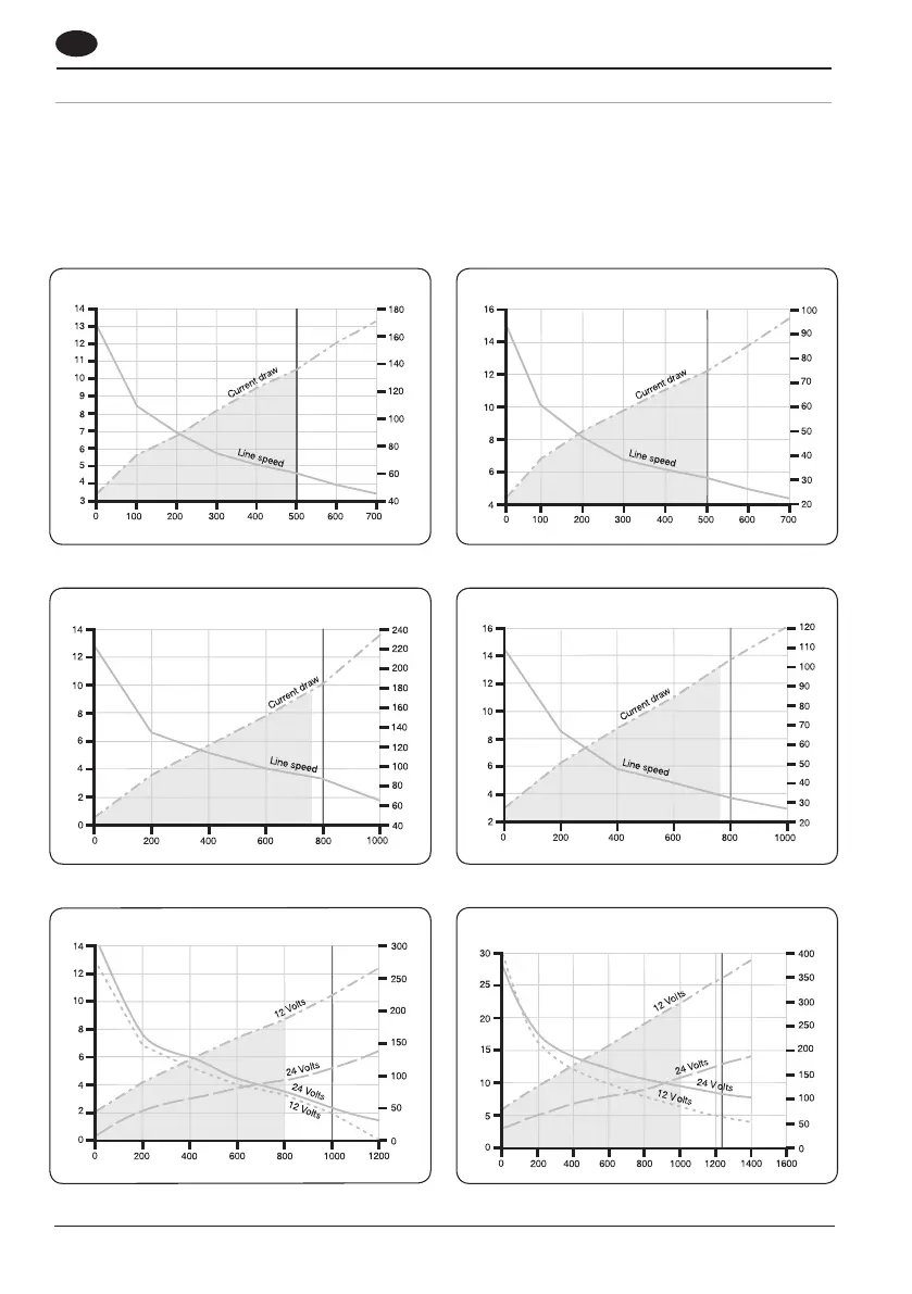 The following graphs show line speed and amperage draw relative to the load applied. Each control box will cut