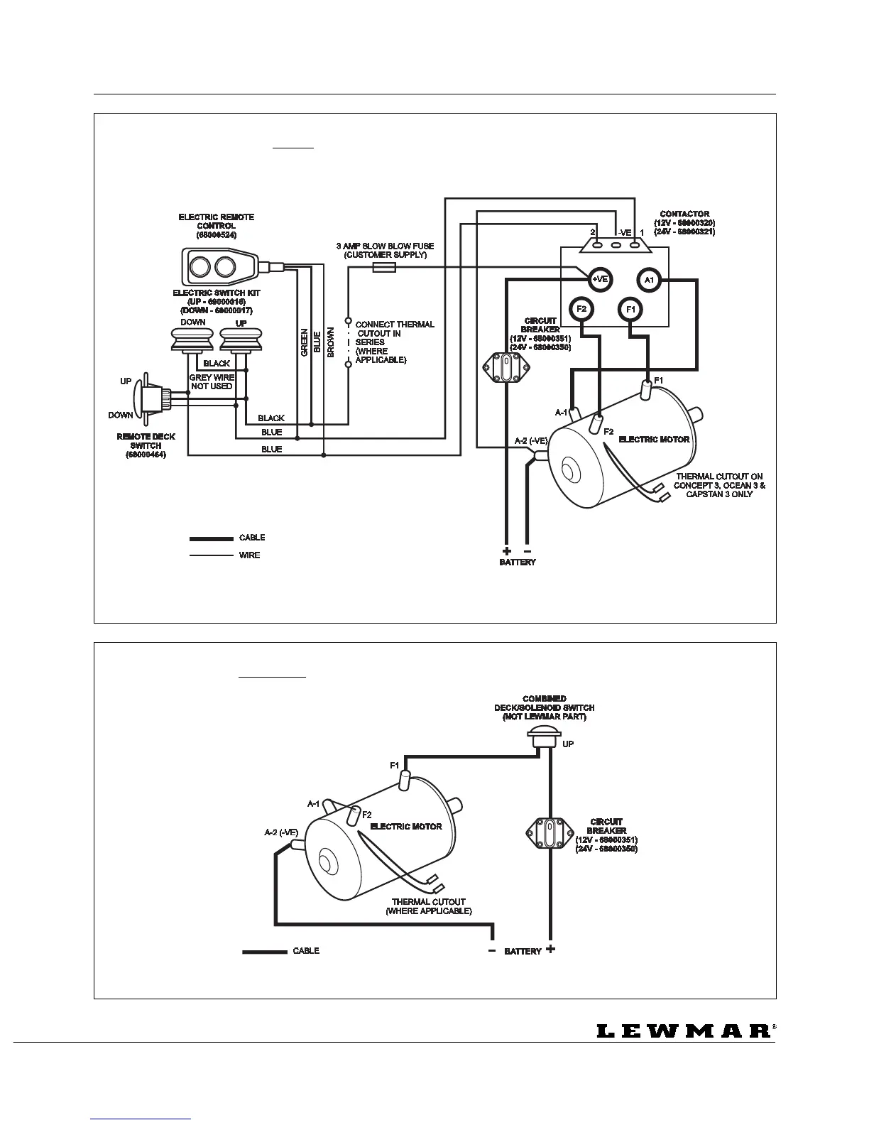 Lewmar Ocean 3 - Electrical Connections (Continued); Concept;Ocean 3 Dual Direction Contactor Wiring; Concept;Ocean;Capstan 3 Single Direction Solenoid Switch Wiring