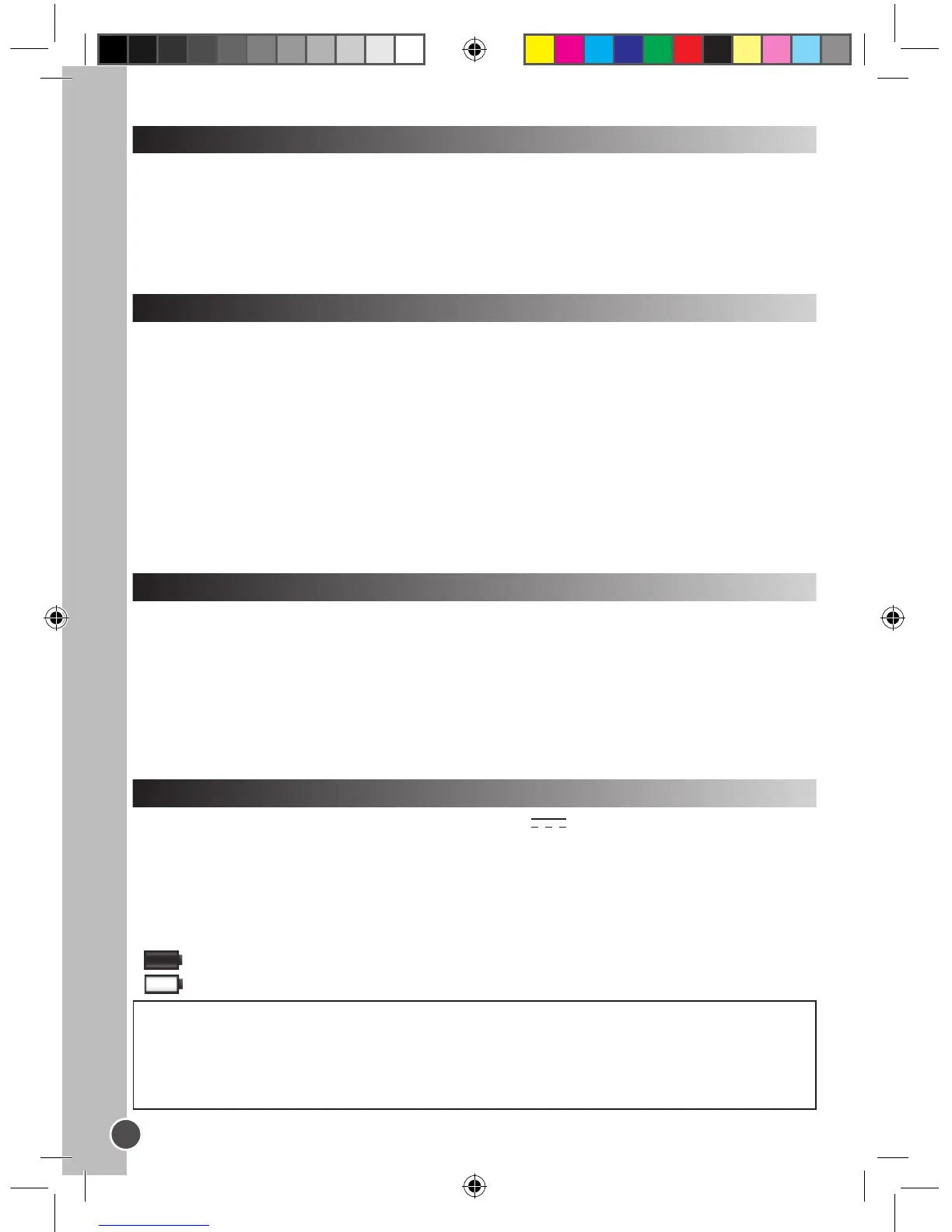 The supply terminals are not to be short circuited. Do not throw batteries into a re. Remove the batteries if you are not
