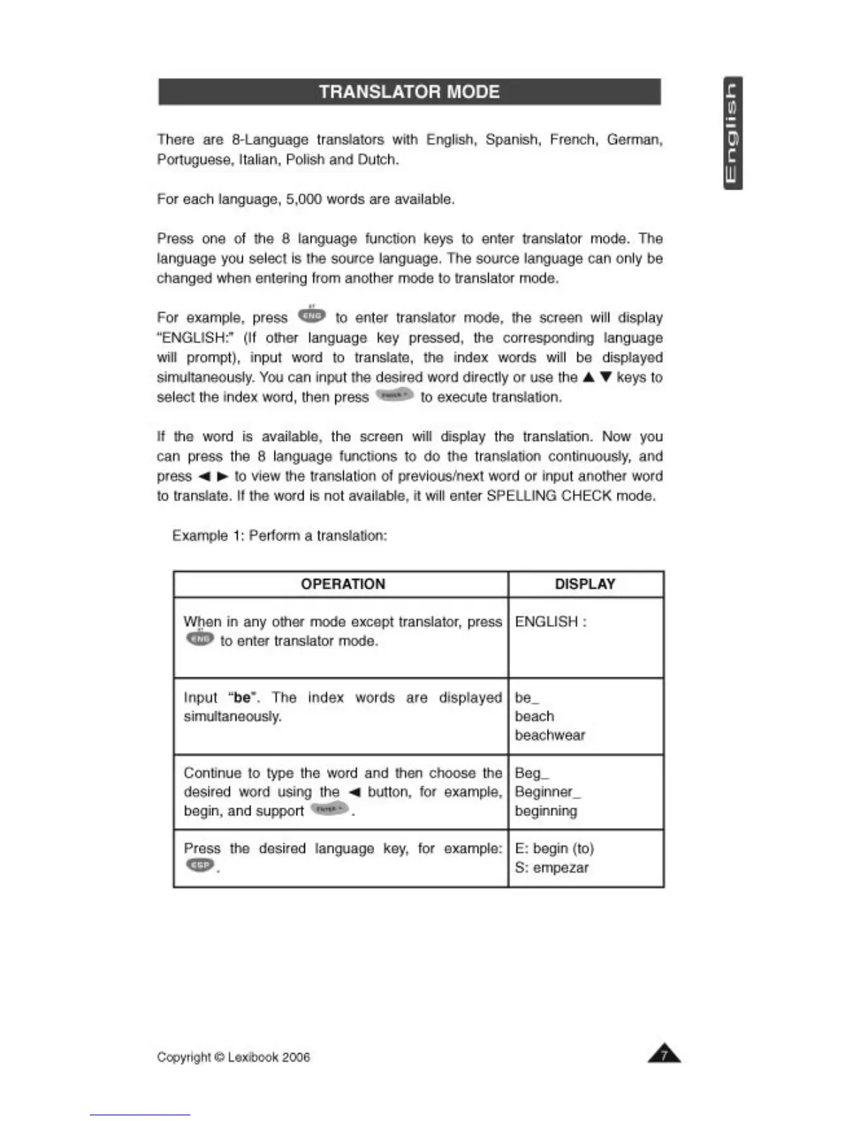 LEXIBOOK NTL800 - Translator Mode; Example 1: Perform a translation