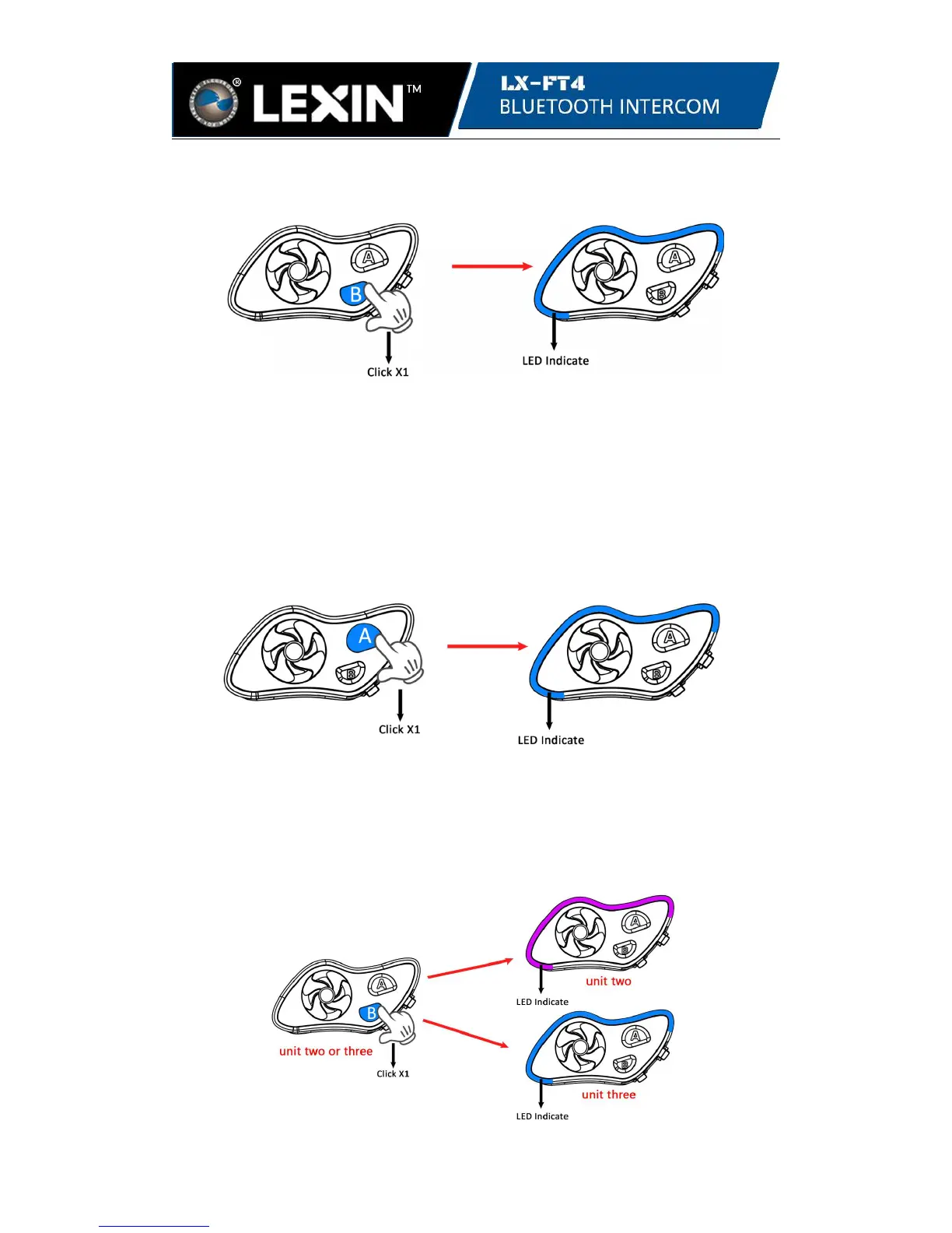Click the B button on unit two or unit three. Once connected, the LED will flash 3