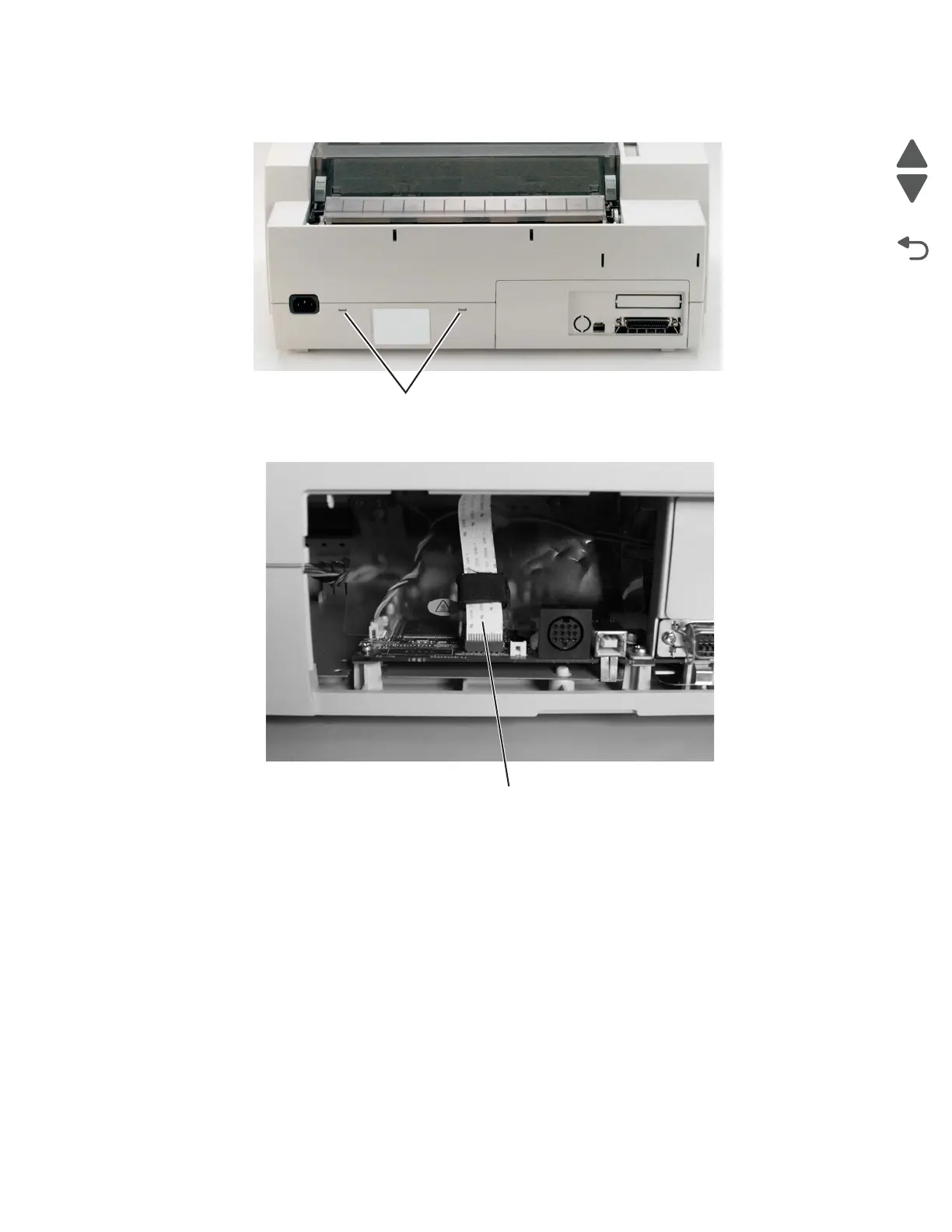 9. Turn the printer right side up, and insert a flat-blade screwdriver into each of the two holes (C) in the back