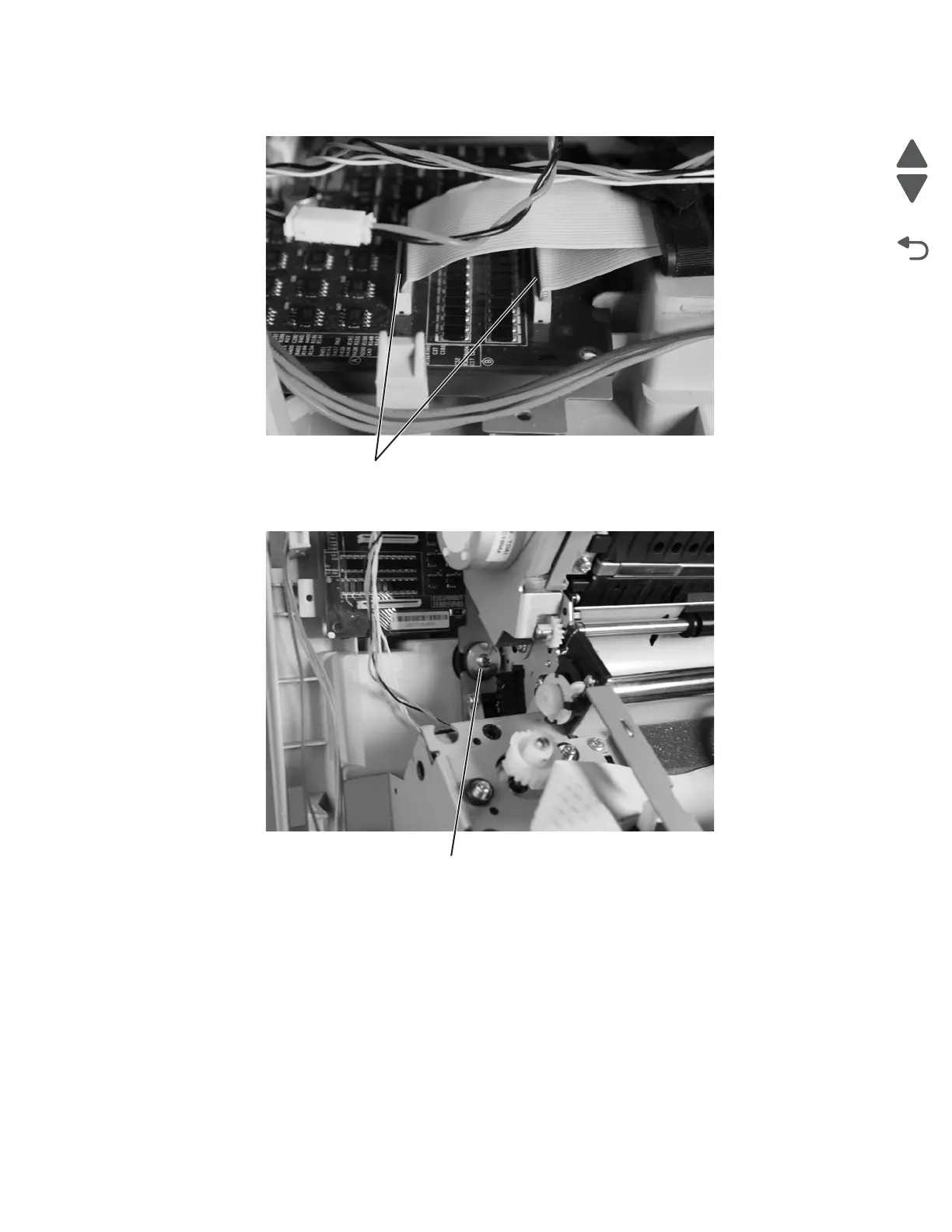 7. Disconnect the printhead cables (B) from the logic board, and move it back and out of the way.