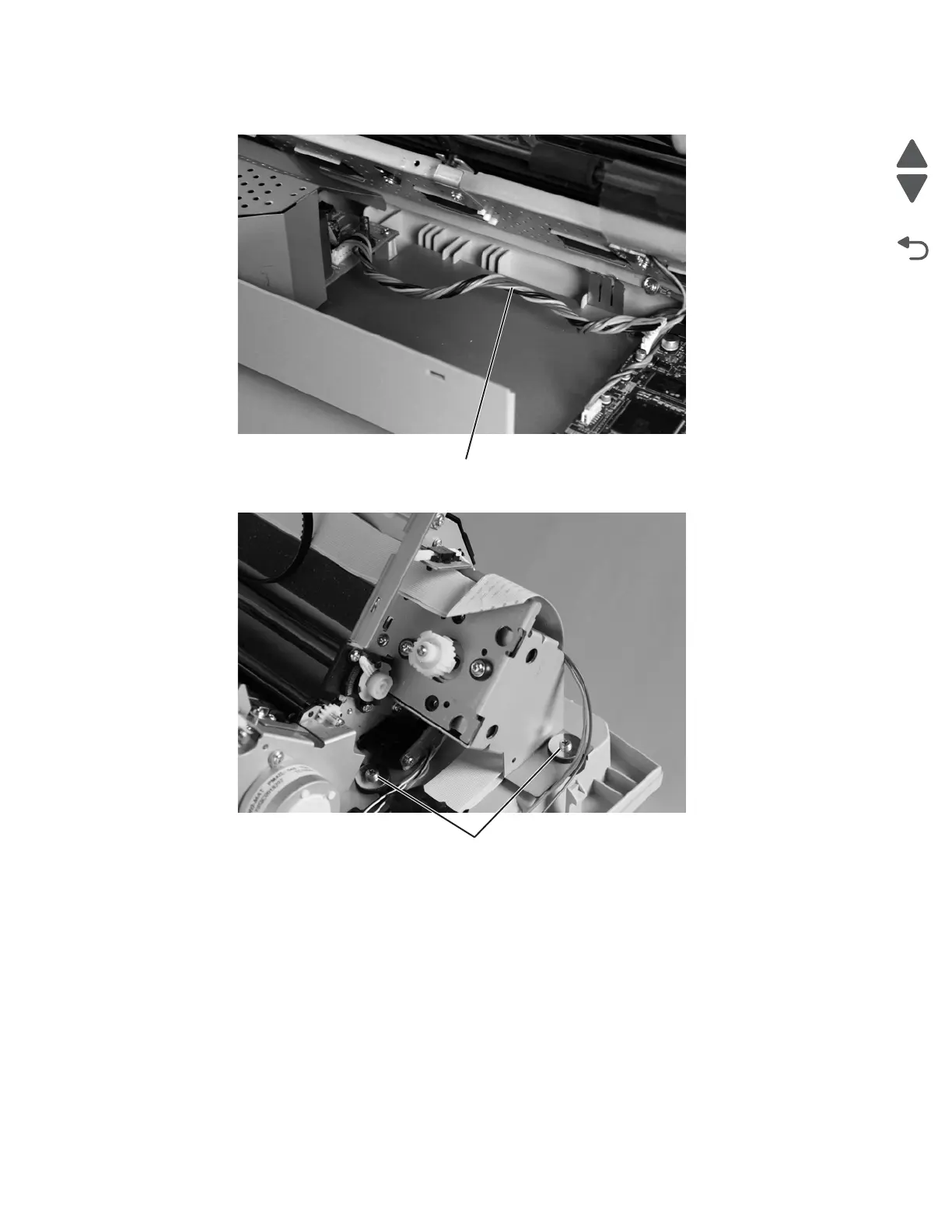 6. Remove the two grommet-anchored screws (B) from the left side of the print unit.