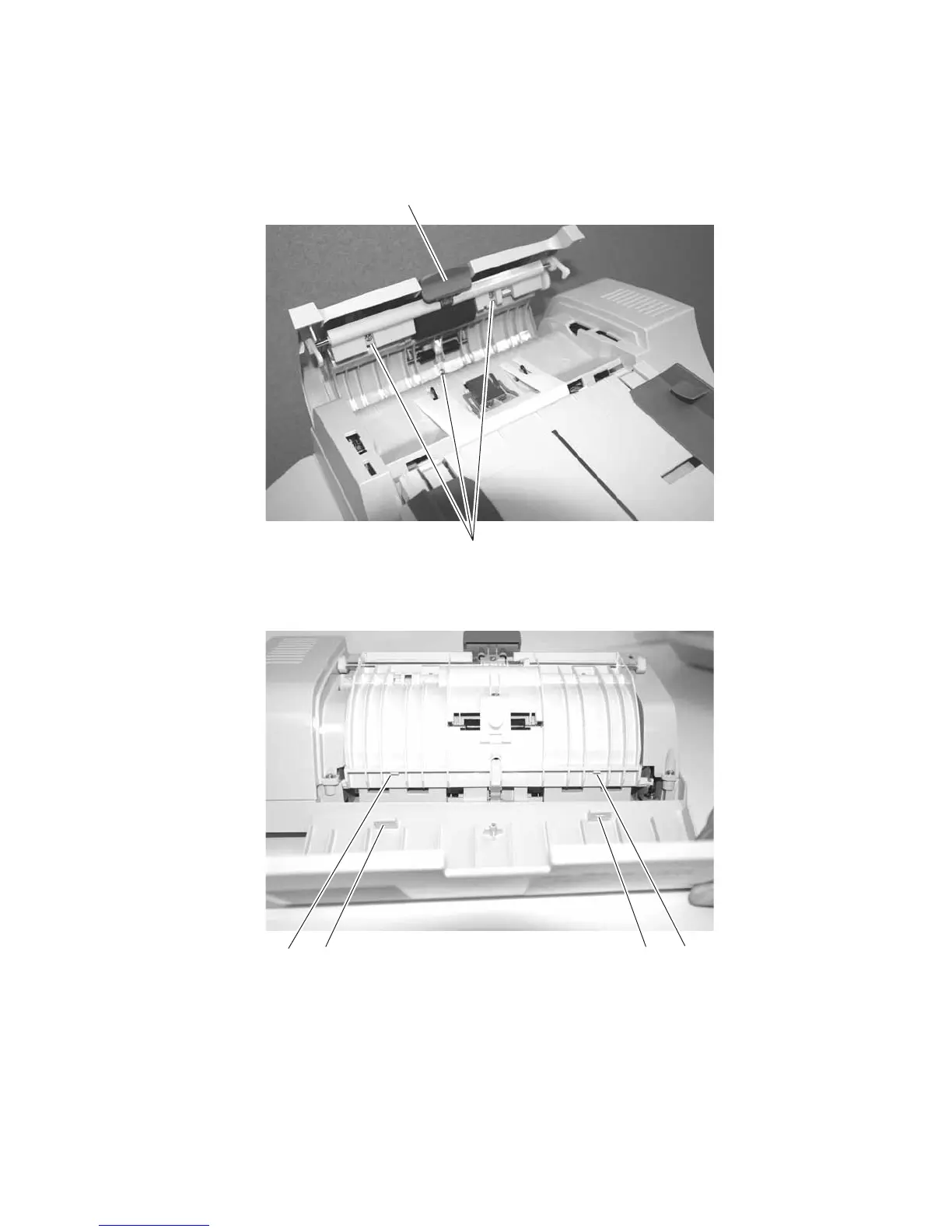 (C) under the tabs (D), and close. Reopen and replace the screws inside the ADF upper cover.