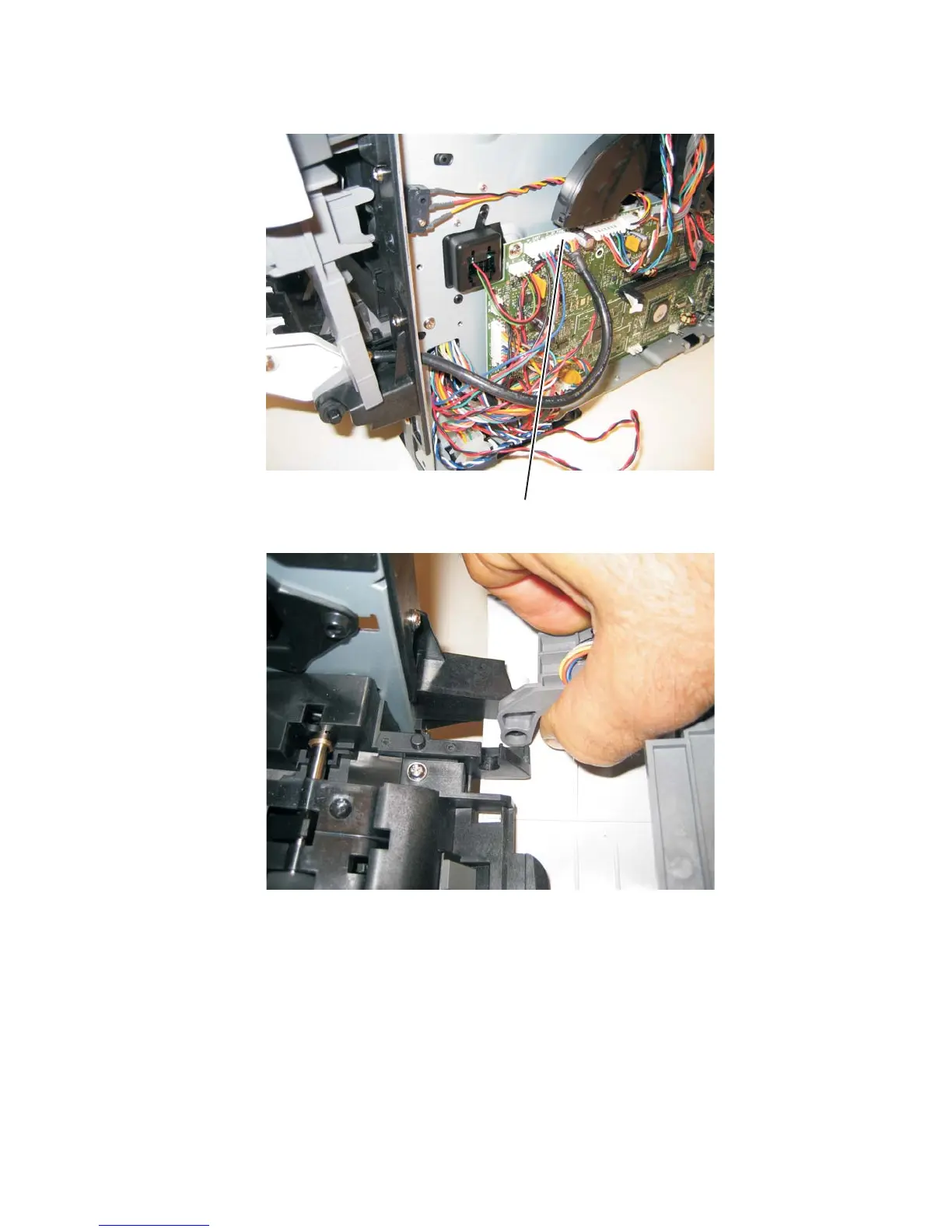 8. Disconnect the front access door cable (B), and pull it through the opening to clear the side frame.