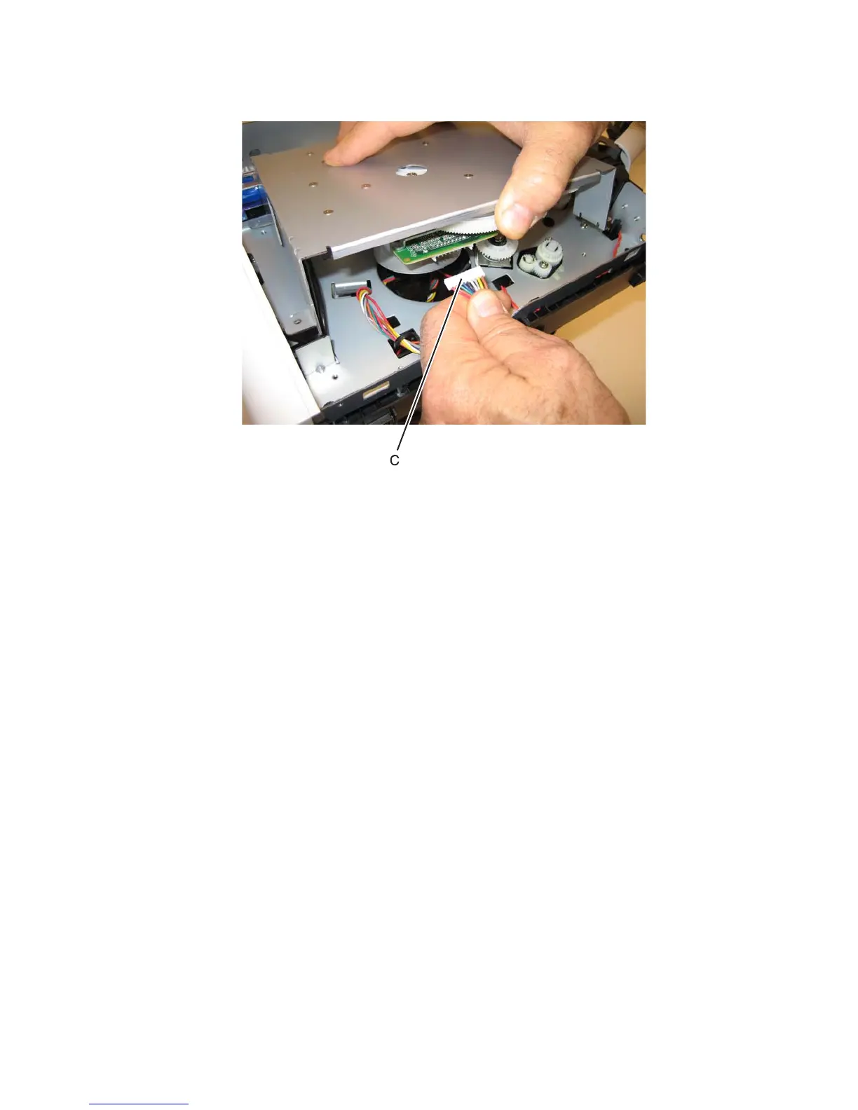 5. Lift the gear drive, and disconnect the main motor gear drive cable (C).