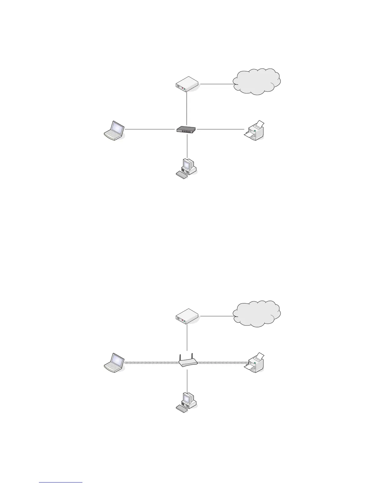 • Scenario 3: Desktop computer, laptop, and printer connected wirelessly without Internet