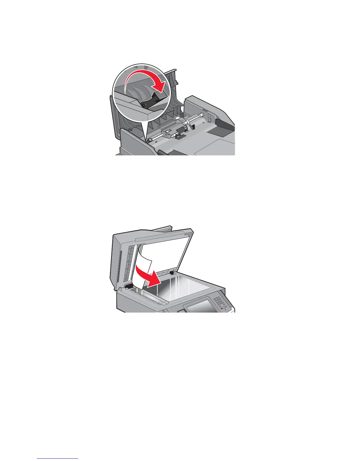 Clearing ADF jams under the flatbed cover.