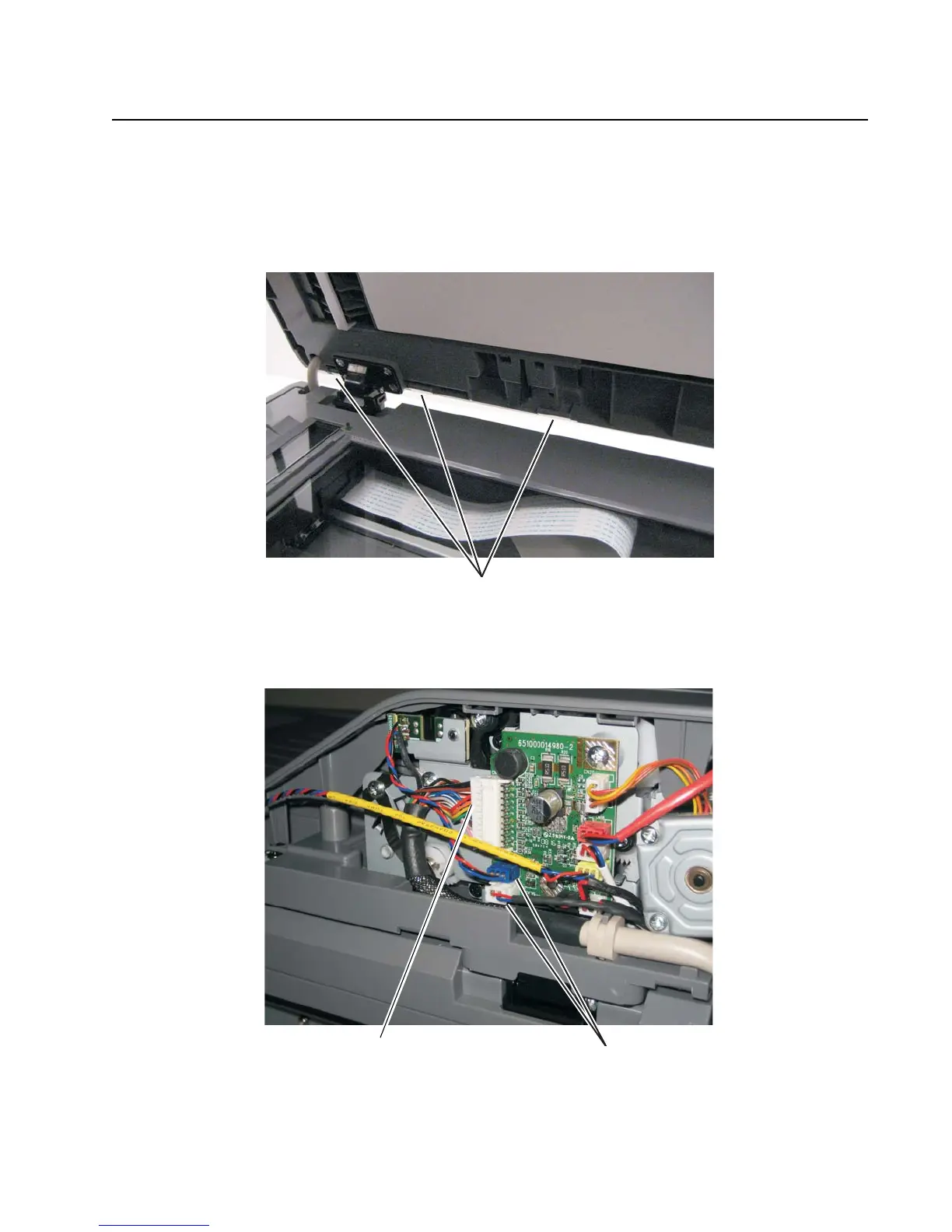 1. Remove the ADF rear cover by releasing the three tabs (A) which fasten the ADF rear cover to the ADF