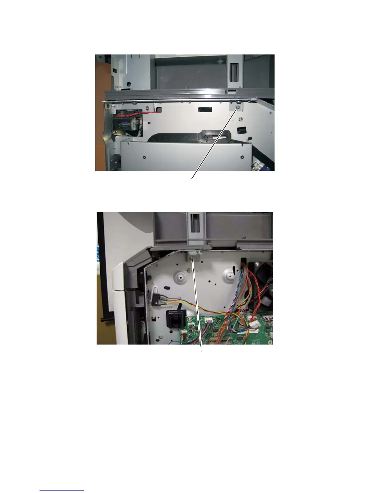 19. Remove the side screw (F) securing the right flatbed stop to the print engine frame.