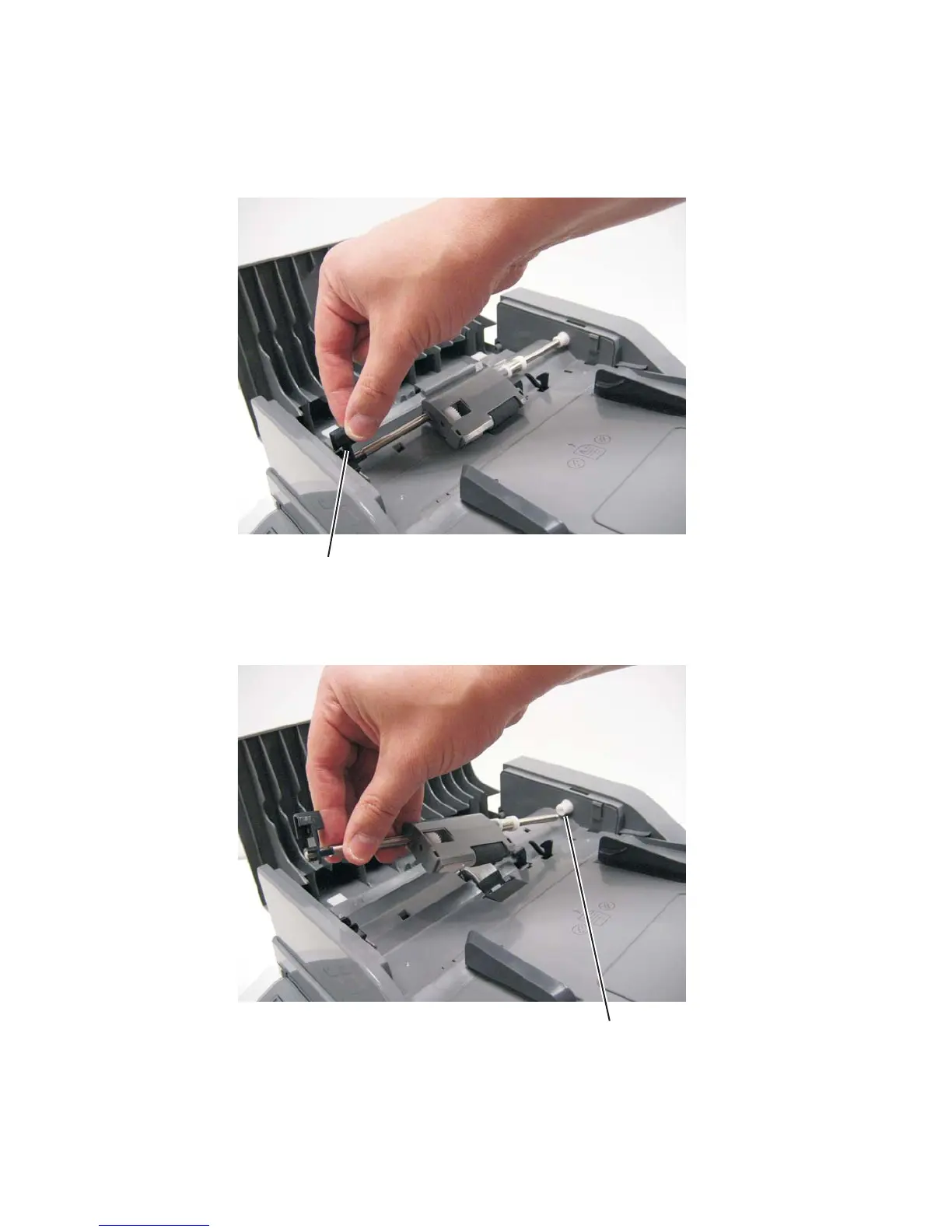 2. Slightly lift the separator roll assembly, and pull it out of the mount (B) on the opposite side.