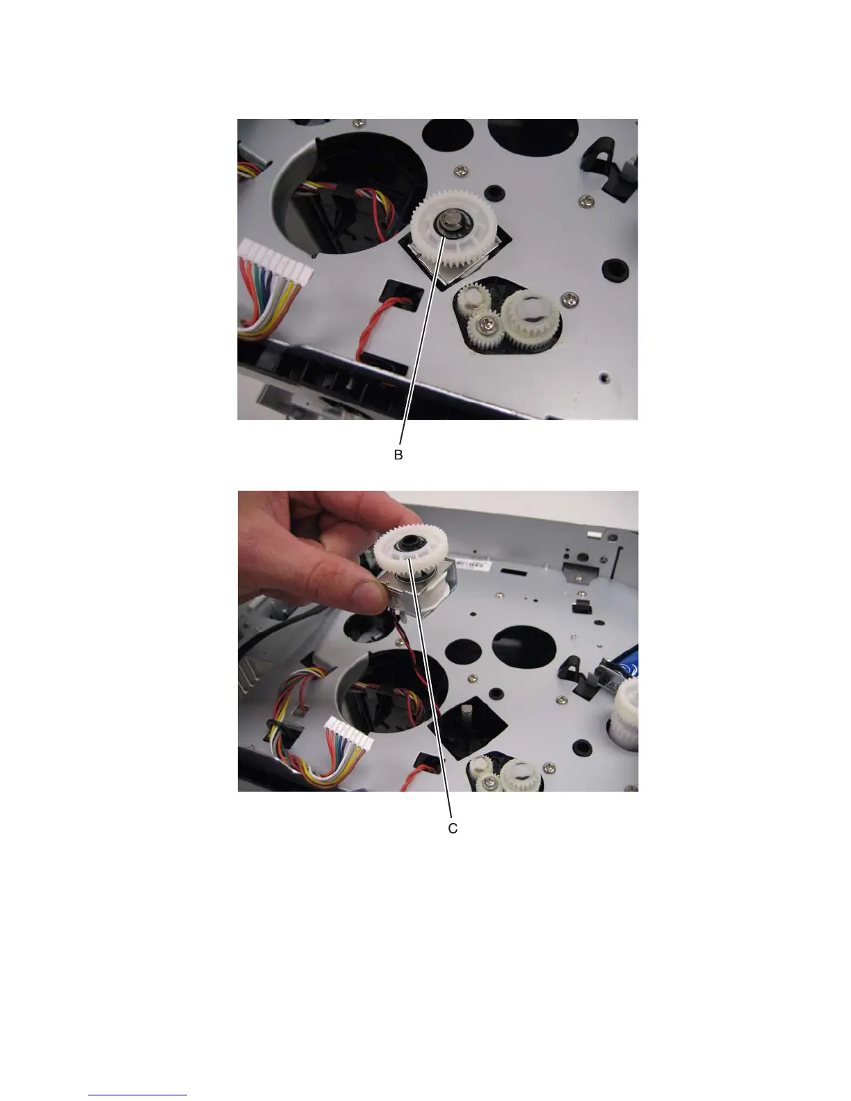 6. Remove the media feed clutch with cable (C).