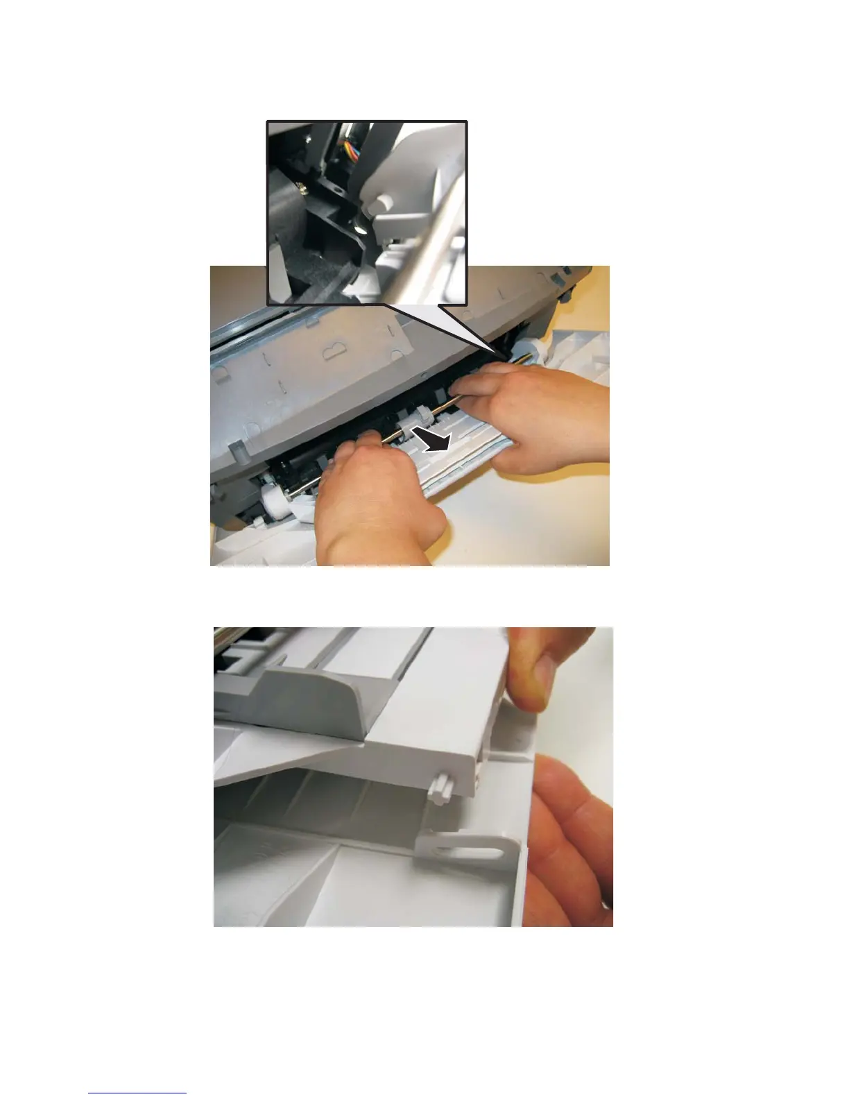 5. Close the front access door, and pull up on the MPF by the steel shaft until the MPF lifts from its hinges.