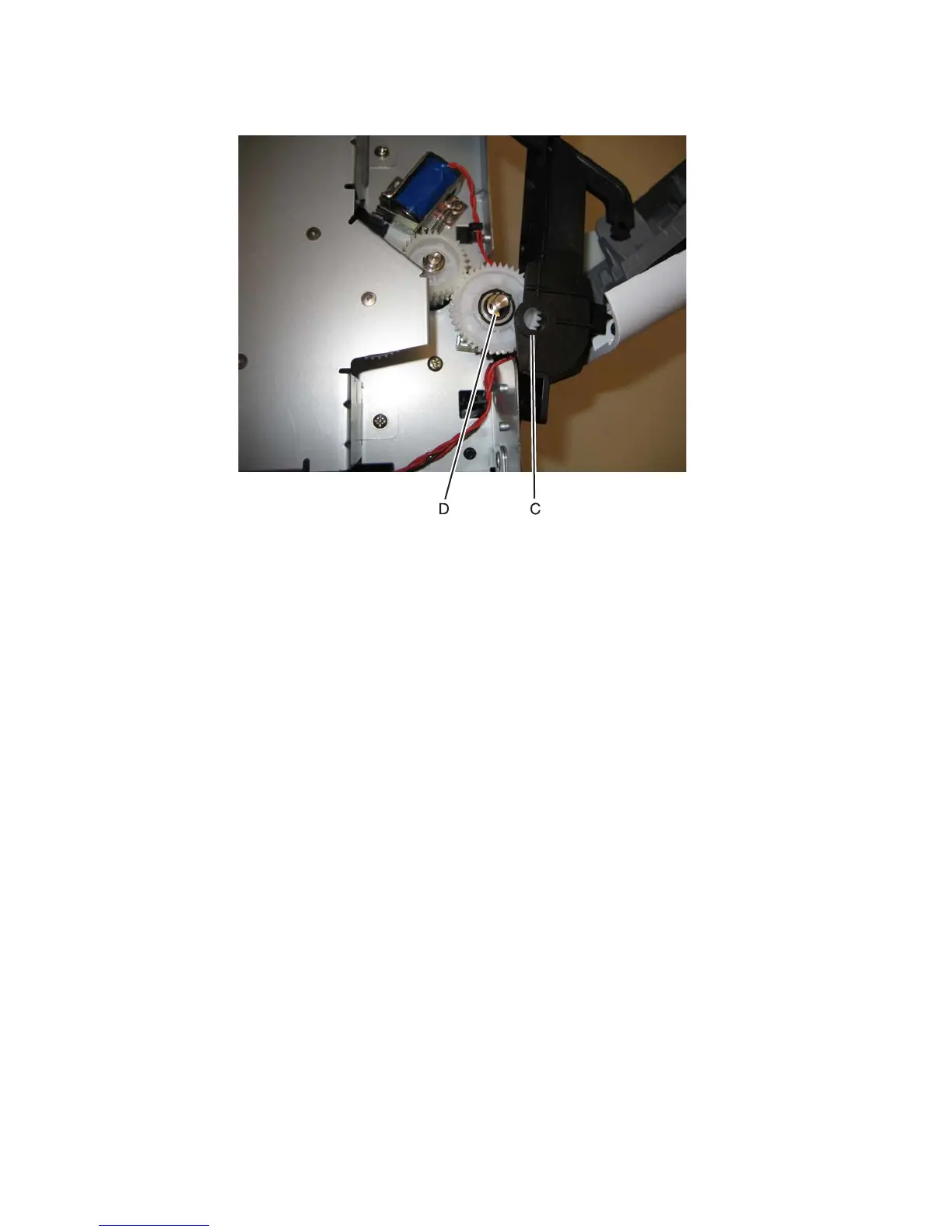 6. Disconnect the left hinge (C) from the feed clutch, and remove the e-clip (D).