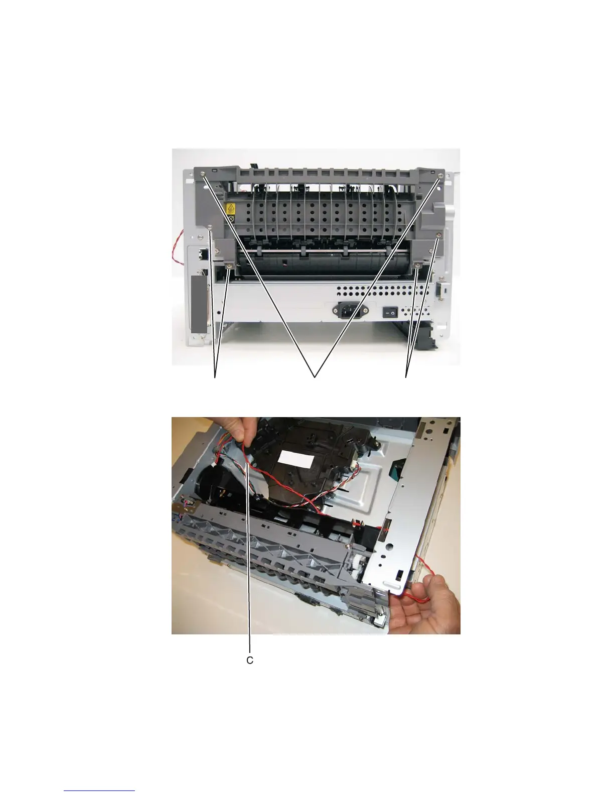 4. Remove the six screws (B) from the rear exit guide assembly.