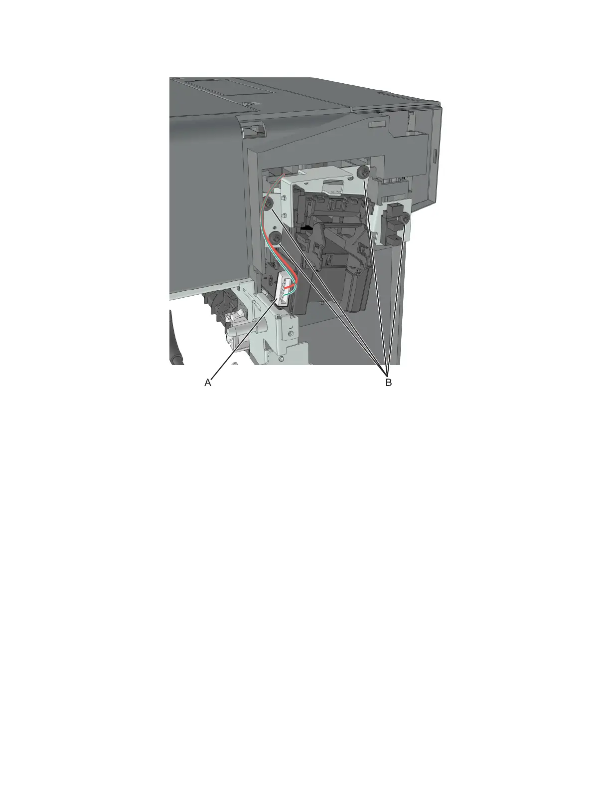 3 Remove the four screws (B) securing the carriage frame to the stapler.