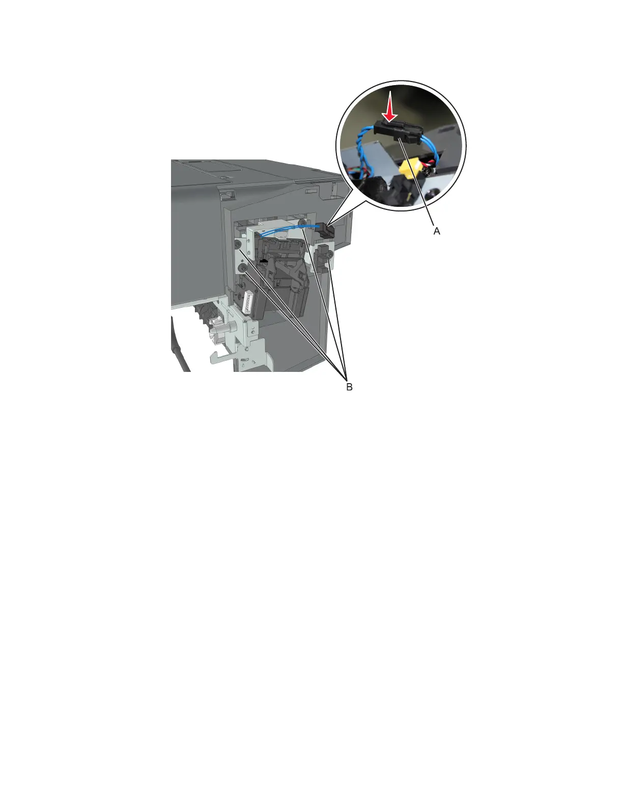 3 Remove the four screws (B) securing the carriage frame to the stapler.