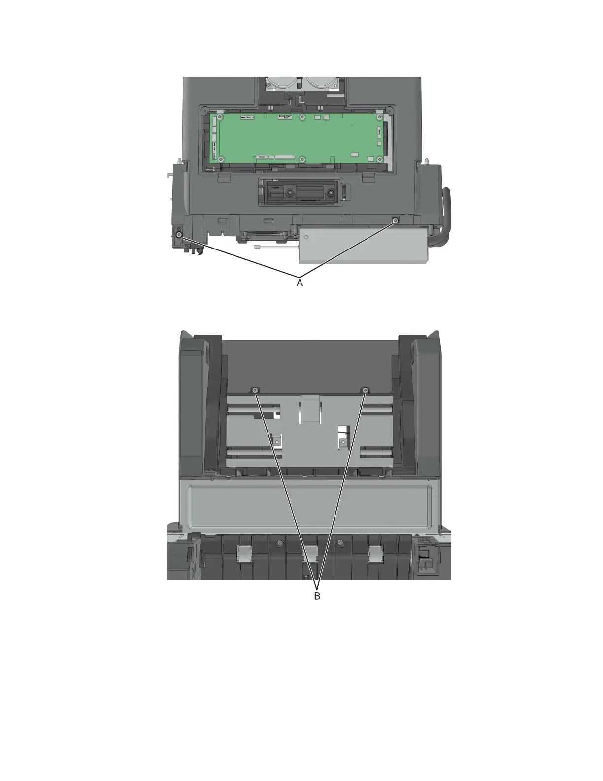 7 Remove the two screws (B) under the cover.