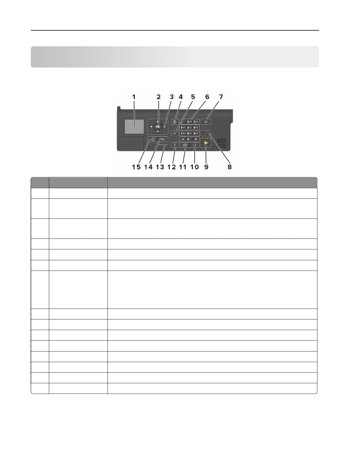 1 Display View printing options, printer status, and error messages.
