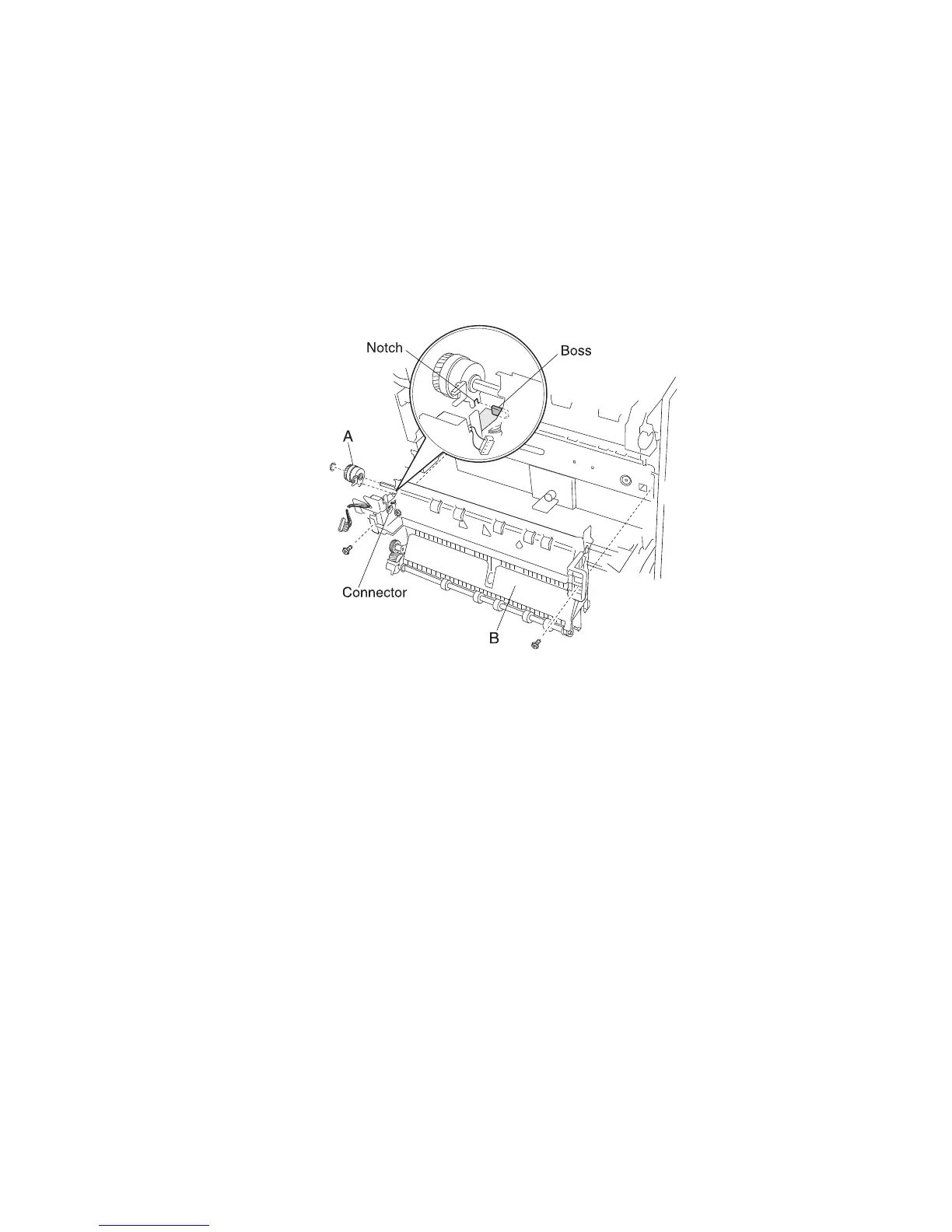 5. Remove the two screws securing the plate (A) to the registration transport roll assembly (B).