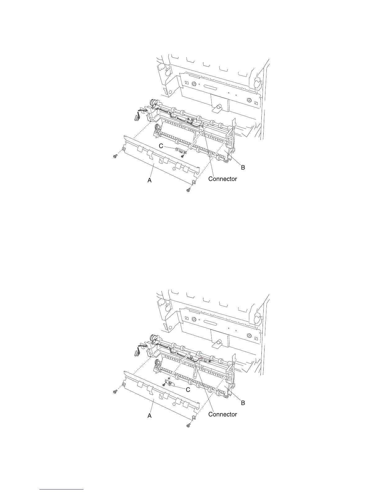 5. Remove the two screws securing the plate (A) to the registration transport roll assembly (B).