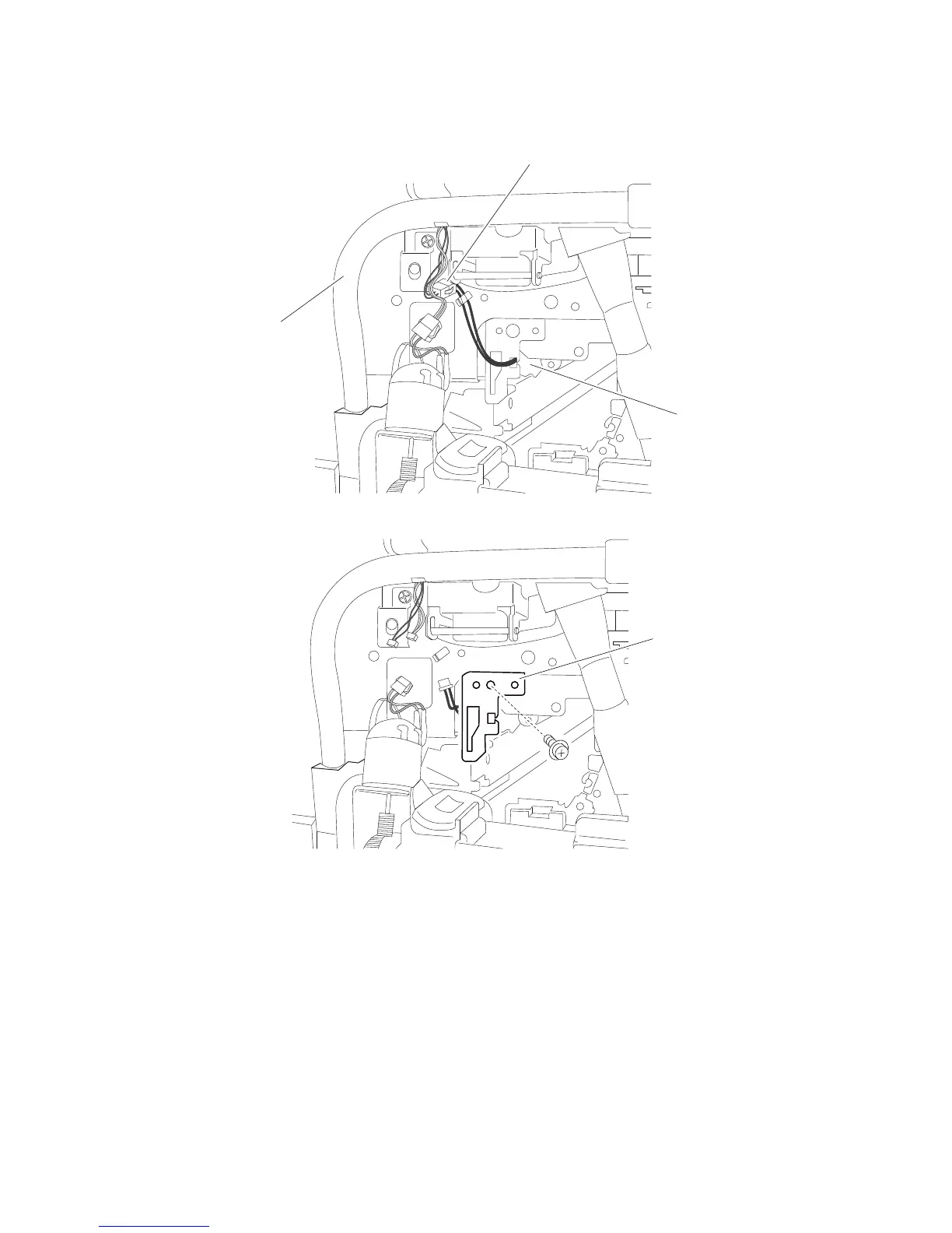 13. Gently raise the rear of the K erase lamp assembly (B) to detach the mounting hook from the machine.