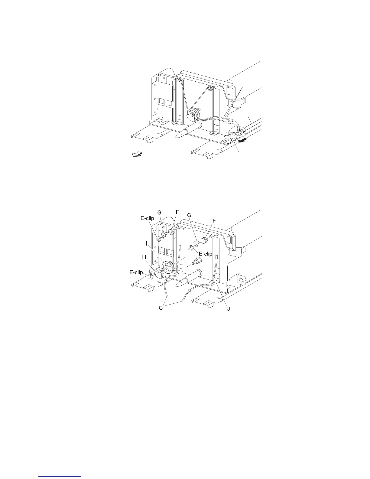 10. Remove the two small guides (G) and the two small pulleys (F).
