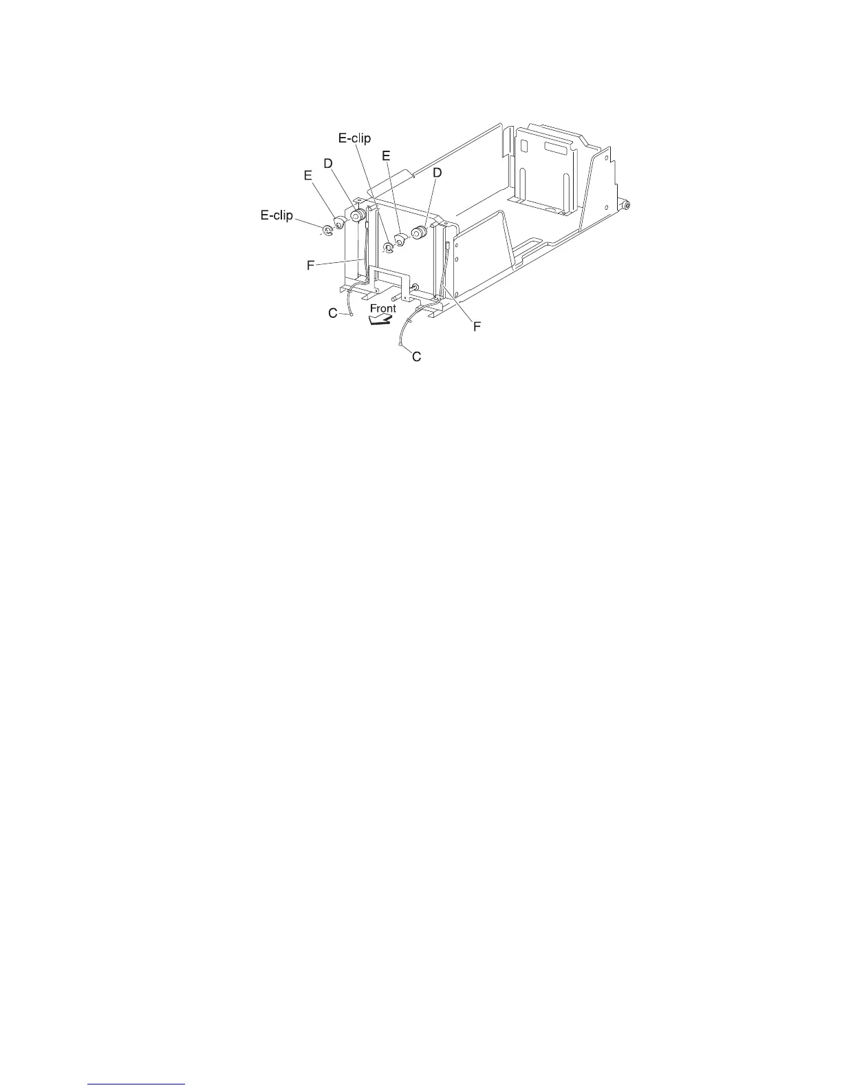 10. Remove the tray 4 front cables (C) from the bottom plates (F).