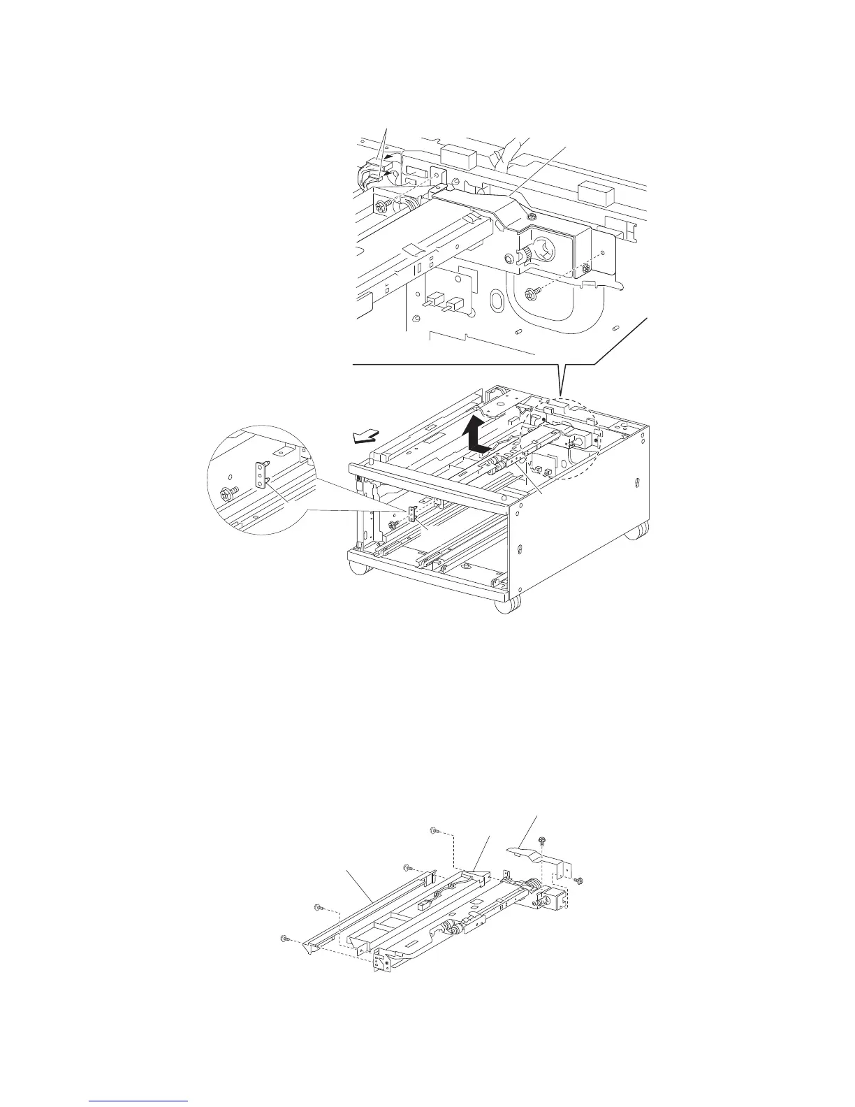 14. Remove the two screws securing the upper guide (D) to the media feed unit assembly (A).