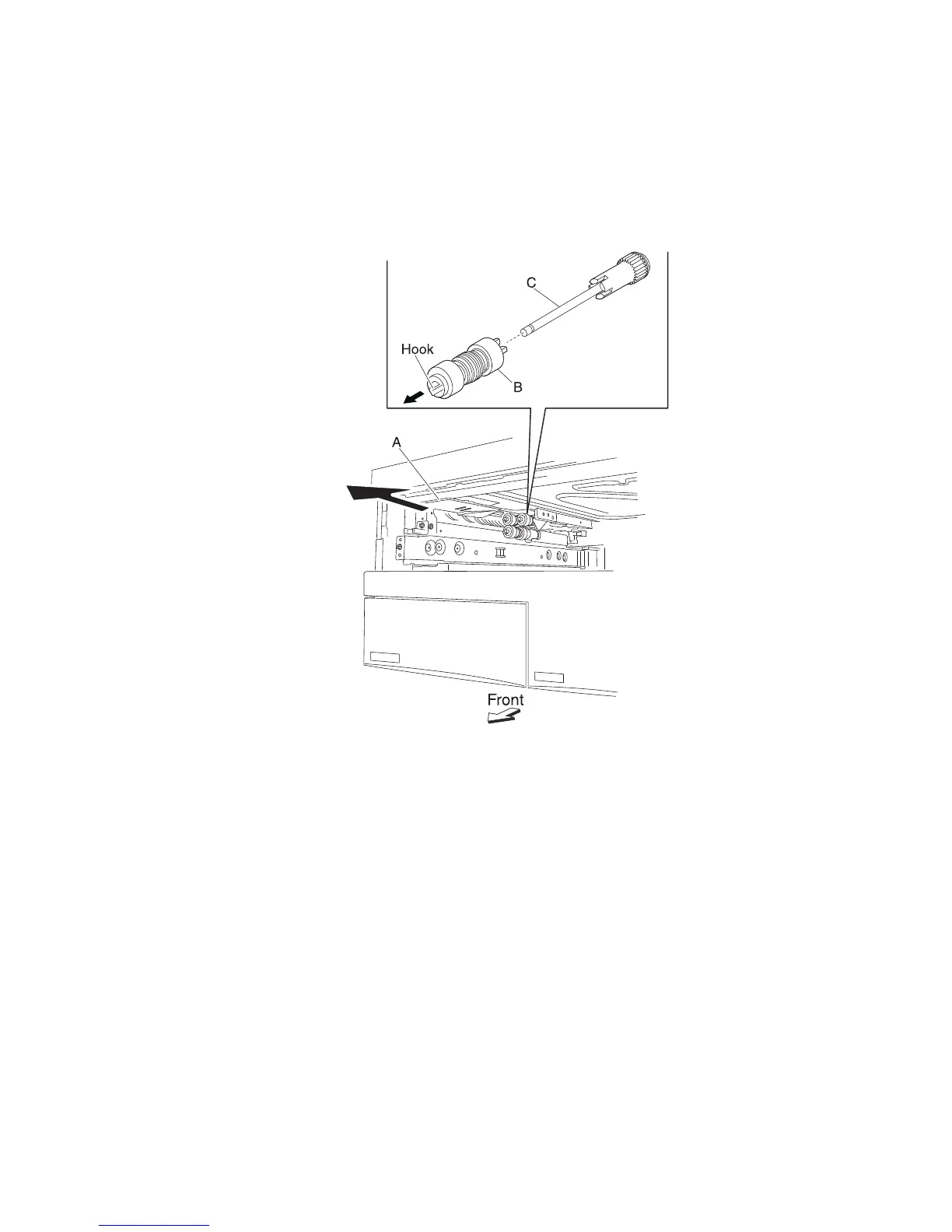 3. Release the hook securing the pick roll (B) to the shaft (C).
