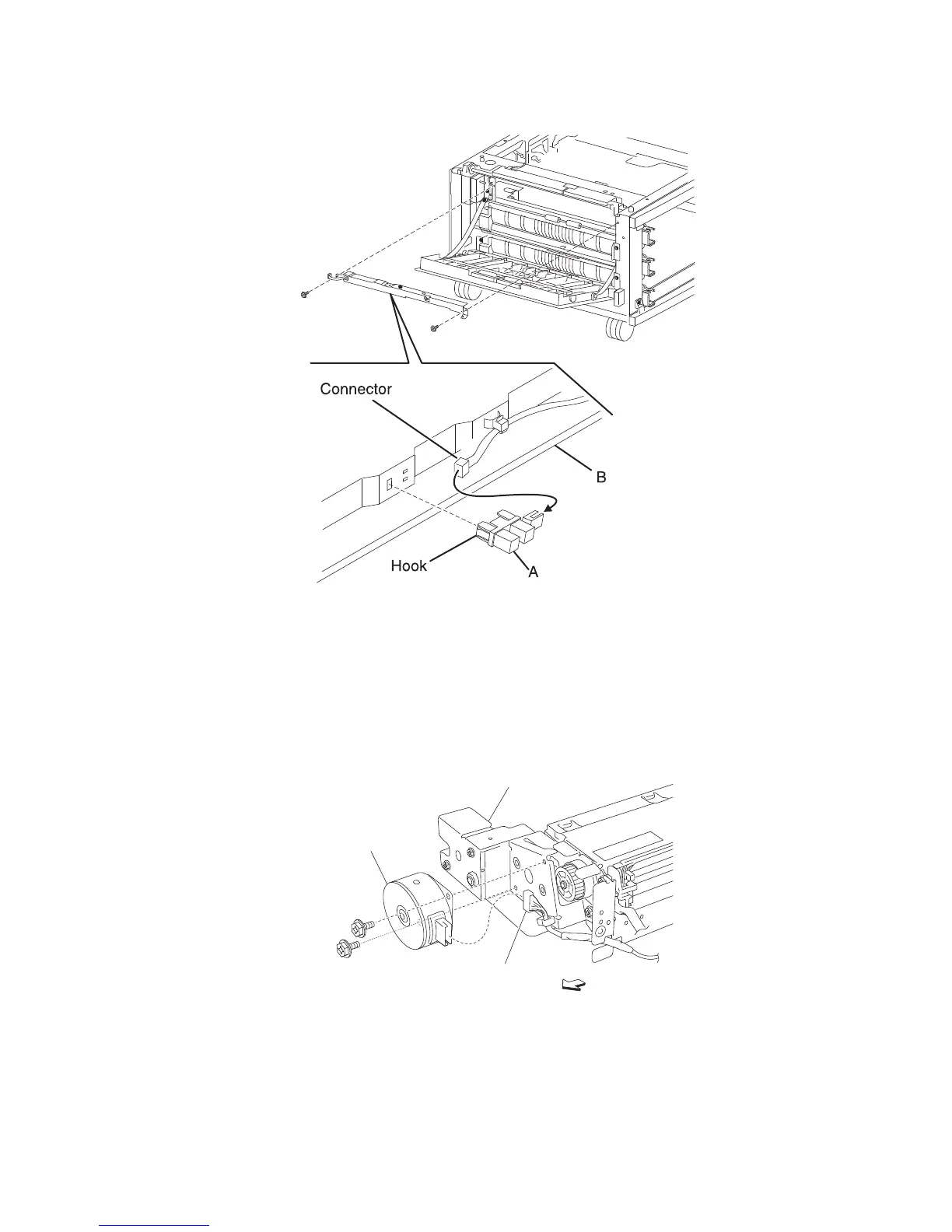 3. Remove the two screws securing the media feed lift motor to the media feed unit assembly (B).