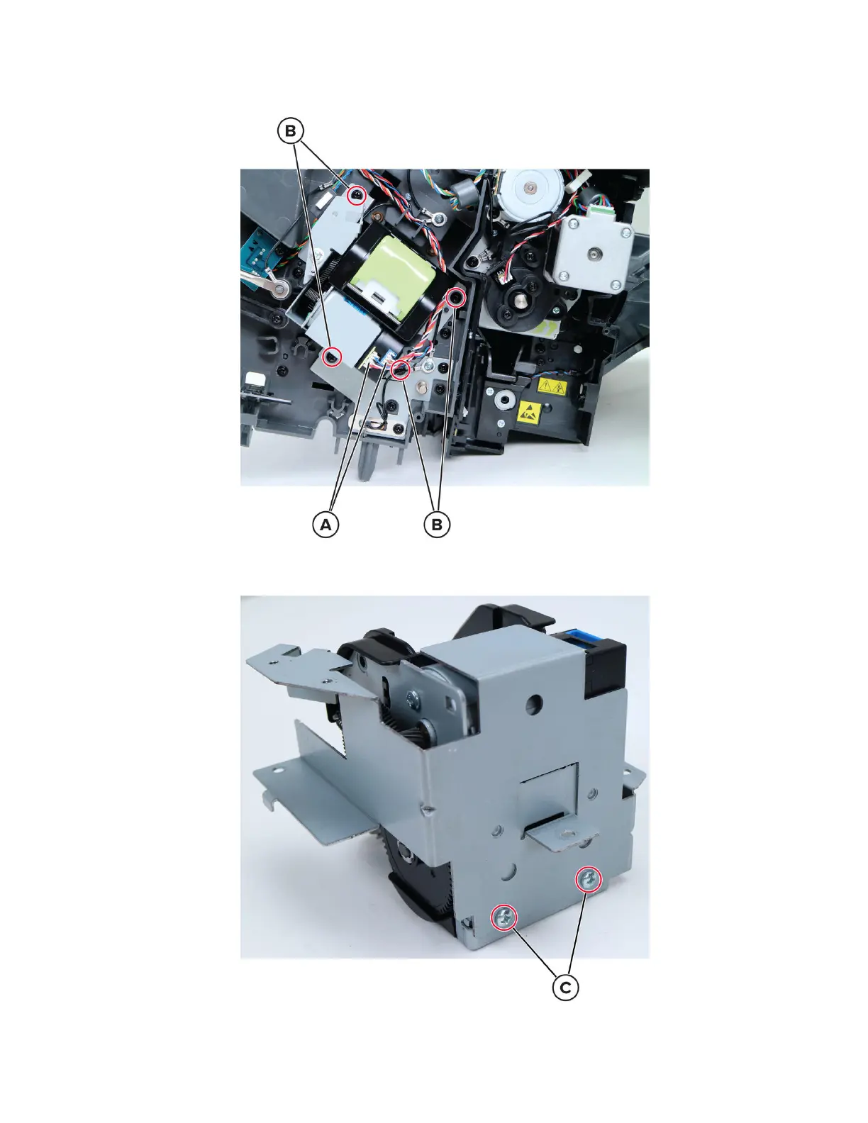 3 Disconnect the two cables (A), remove the four screws (B), and then remove the bracket.