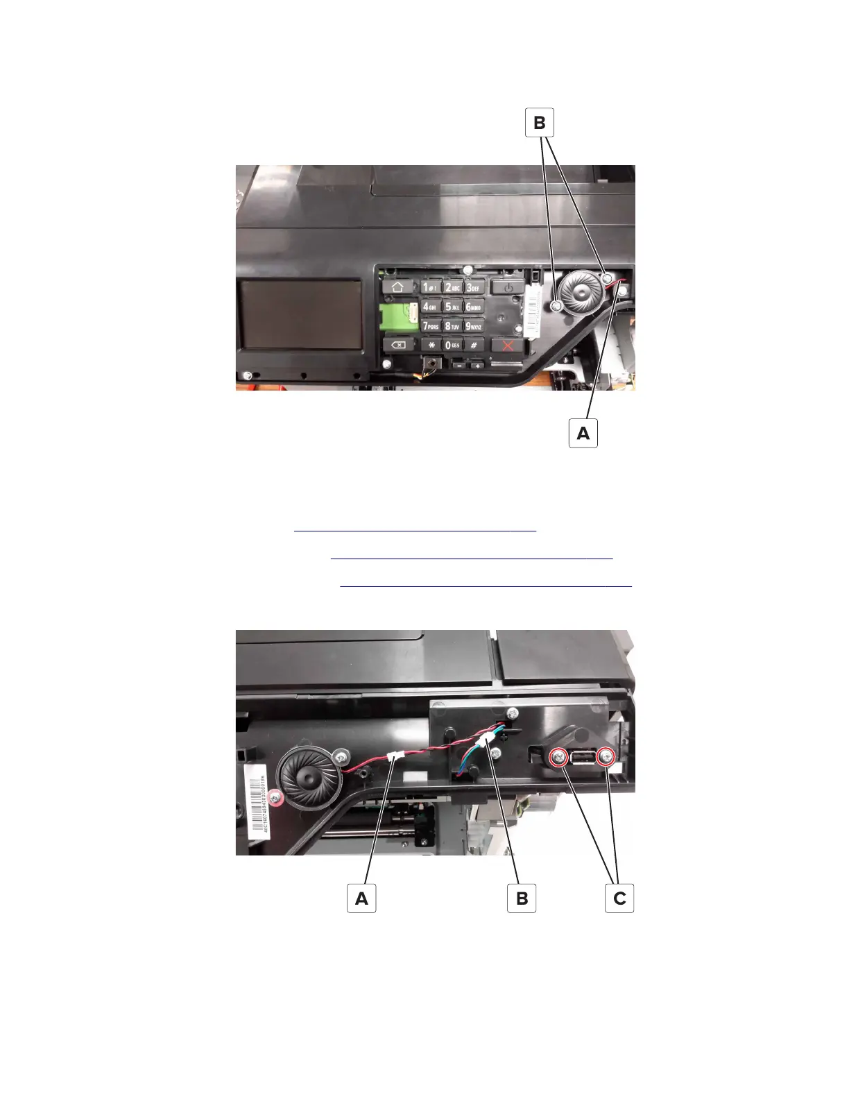 4 Disconnect the speaker cable (A) and sensor cable (B), and then remove the two screws (C).