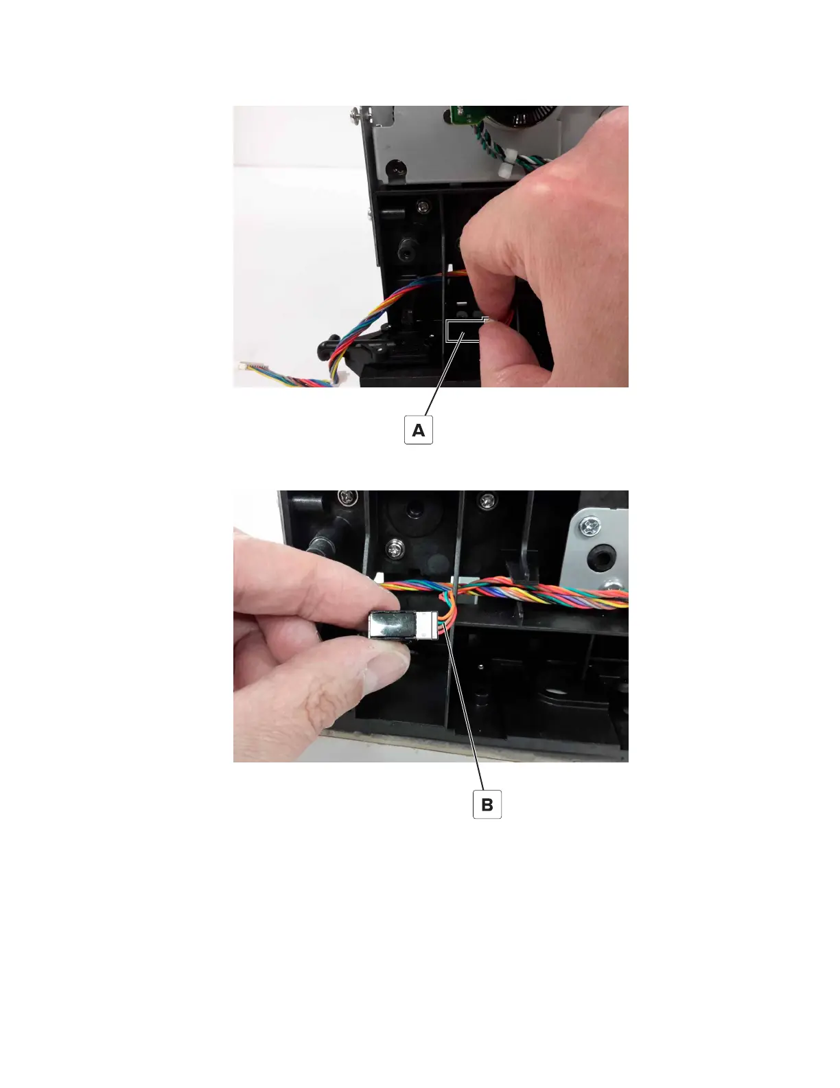 4 Pull the sensor (MPF paper present) and cable out of the printer.