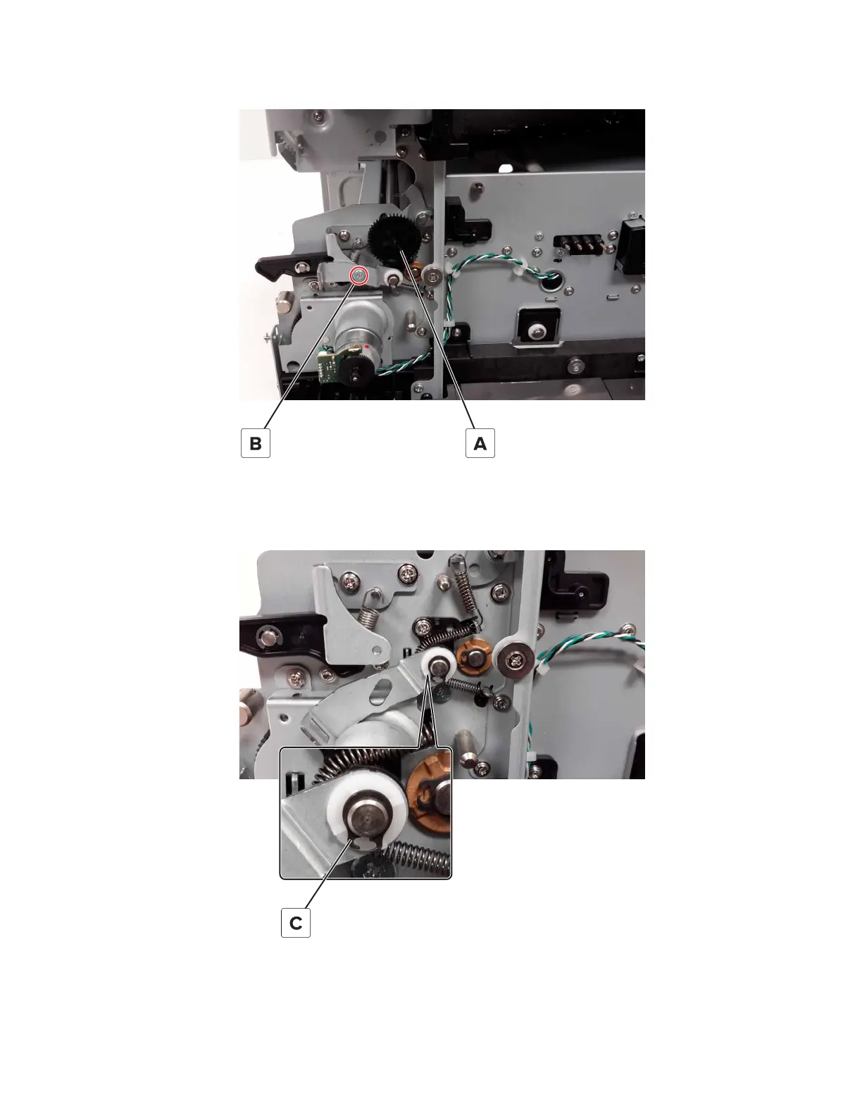 7 On the right side of the printer, remove the gear (A), and then remove the screw (B).