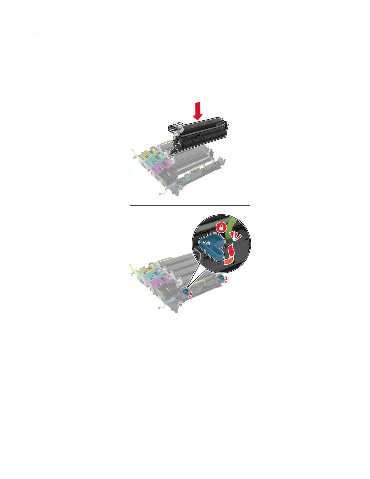 Warning—Potential Damage: Do not touch the shiny photoconductor drum under the imaging kit. Doing